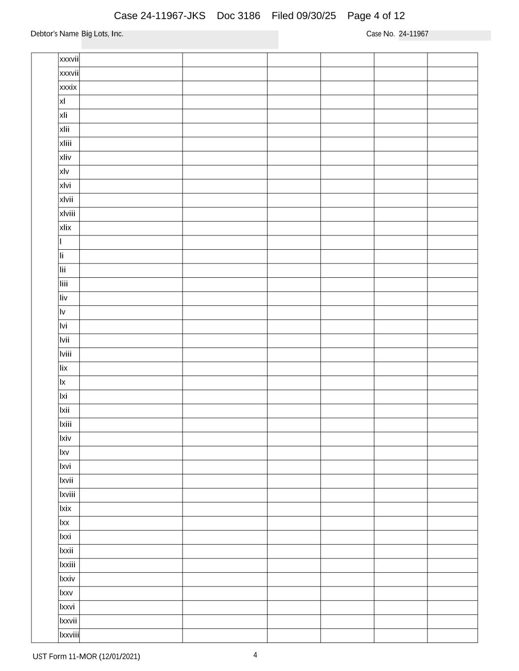 UST Form 11-MOR (12/01/2021) 4 Debtor's Name Big Lots, Inc. Case No. 24-11967 xxxvii xxxvii xxxix xl xli xlii xliii xliv xlv xlvi xlvii xlviii xlix l li lii liii liv lv lvi lvii lviii lix lx lxi lxii lxiii lxiv lxv lxvi lxvii lxviii lxix lxx lxxi lxxii lxxiii lxxiv lxxv lxxvi lxxvii lxxviii Case 24-11967-JKS Doc 3186 Filed 09/30/25 Page 4 of 12