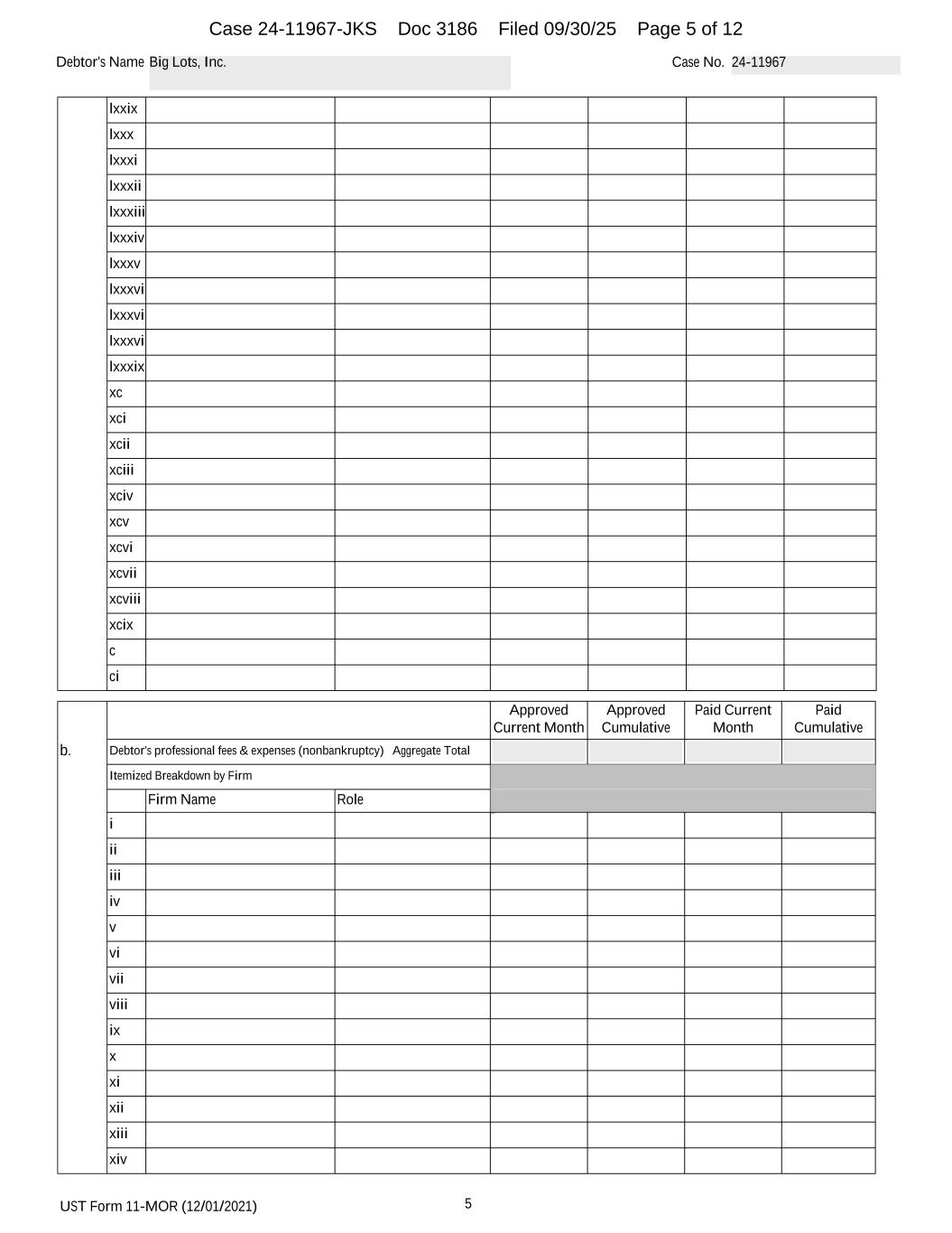 UST Form 11-MOR (12/01/2021) 5 Debtor's Name Big Lots, Inc. Case No. 24-11967 lxxix lxxx lxxxi lxxxii lxxxiii lxxxiv lxxxv lxxxvi lxxxvi lxxxvi lxxxix xc xci xcii xciii xciv xcv xcvi xcvii xcviii xcix c ci Approved Current Month Approved Cumulative Paid Current Month Paid Cumulative b. Debtor's professional fees & expenses (nonbankruptcy) Aggregate Total Itemized Breakdown by Firm Firm Name Role i ii iii iv v vi vii viii ix x xi xii xiii xiv Case 24-11967-JKS Doc 3186 Filed 09/30/25 Page 5 of 12
