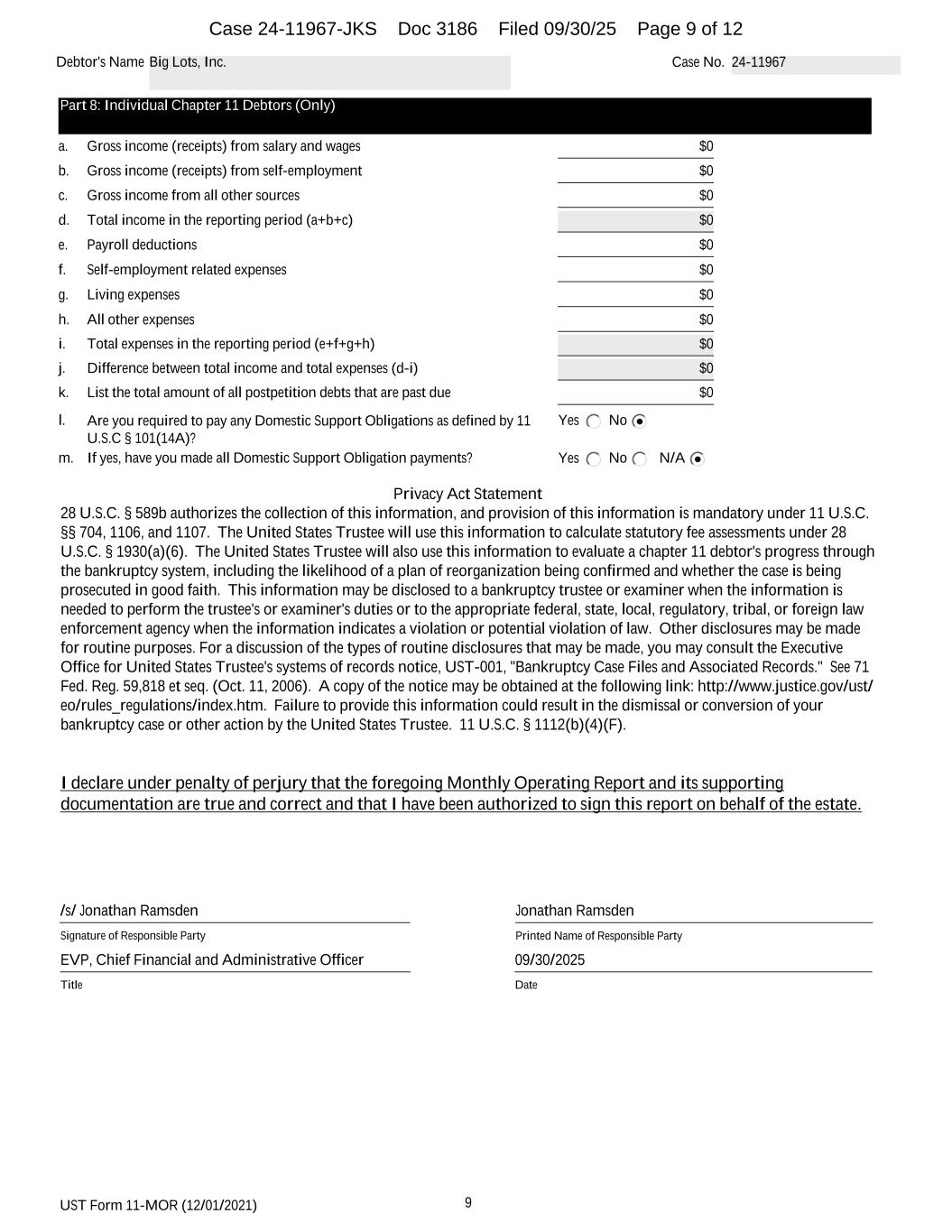 UST Form 11-MOR (12/01/2021) 9 Debtor's Name Big Lots, Inc. Case No. 24-11967 Part 8: Individual Chapter 11 Debtors (Only) a. Gross income (receipts) from salary and wages $0 b. Gross income (receipts) from self-employment $0 c. Gross income from all other sources $0 d. Total income in the reporting period (a+b+c) $0 e. Payroll deductions $0 f. Self-employment related expenses $0 g. Living expenses $0 h. All other expenses $0 i. Total expenses in the reporting period (e+f+g+h) $0 j. Difference between total income and total expenses (d-i) $0 k. List the total amount of all postpetition debts that are past due $0 l. Are you required to pay any Domestic Support Obligations as defined by 11 U.S.C § 101(14A)? Yes No m. Yes No N/AIf yes, have you made all Domestic Support Obligation payments? Privacy Act Statement 28 U.S.C. § 589b authorizes the collection of this information, and provision of this information is mandatory under 11 U.S.C. §§ 704, 1106, and 1107. The United States Trustee will use this information to calculate statutory fee assessments under 28 U.S.C. § 1930(a)(6). The United States Trustee will also use this information to evaluate a chapter 11 debtor's progress through the bankruptcy system, including the likelihood of a plan of reorganization being confirmed and whether the case is being prosecuted in good faith. This information may be disclosed to a bankruptcy trustee or examiner when the information is needed to perform the trustee's or examiner's duties or to the appropriate federal, state, local, regulatory, tribal, or foreign law enforcement agency when the information indicates a violation or potential violation of law. Other disclosures may be made for routine purposes. For a discussion of the types of routine disclosures that may be made, you may consult the Executive Office for United States Trustee's systems of records notice, UST-001, "Bankruptcy Case Files and Associated Records." See 71 Fed. Reg. 59,818 et seq. (Oct. 11, 2006). A copy of the notice may be obtained at the following link: http://www.justice.gov/ust/ eo/rules_regulations/index.htm. Failure to provide this information could result in the dismissal or conversion of your bankruptcy case or other action by the United States Trustee. 11 U.S.C. § 1112(b)(4)(F). I declare under penalty of perjury that the foregoing Monthly Operating Report and its supporting documentation are true and correct and that I have been authorized to sign this report on behalf of the estate. /s/ Jonathan Ramsden Signature of Responsible Party EVP, Chief Financial and Administrative Officer Printed Name of Responsible Party 09/30/2025 DateTitle Jonathan Ramsden Case 24-11967-JKS Doc 3186 Filed 09/30/25 Page 9 of 12