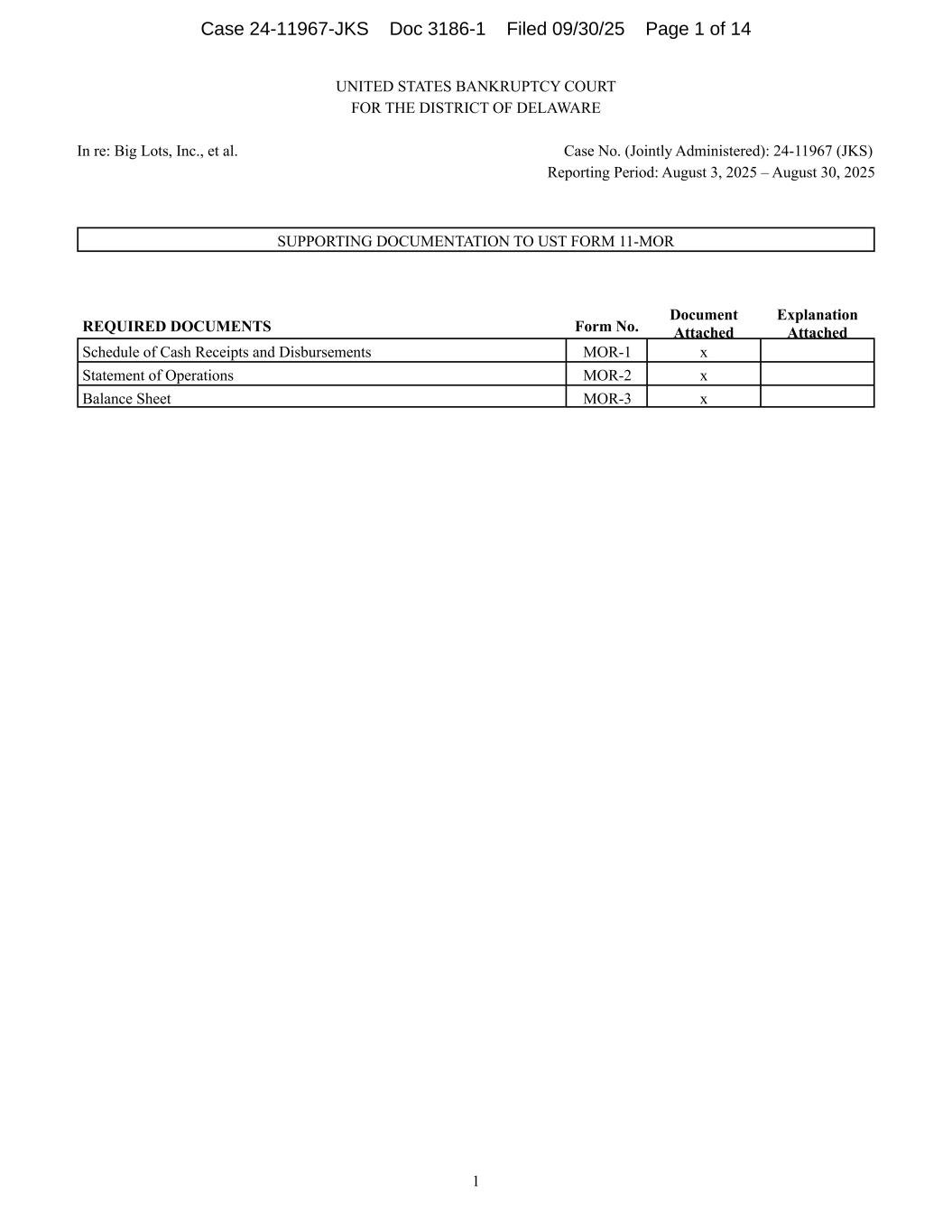 UNITED STATES BANKRUPTCY COURT FOR THE DISTRICT OF DELAWARE In re: Big Lots, Inc., et al. Case No. (Jointly Administered): 24-11967 (JKS) Reporting Period: August 3, 2025 – August 30, 2025 1 SUPPORTING DOCUMENTATION TO UST FORM 11-MOR REQUIRED DOCUMENTS Form No. Document Attached Explanation Attached Schedule of Cash Receipts and Disbursements MOR-1 x Statement of Operations MOR-2 x Balance Sheet MOR-3 x Case 24-11967-JKS Doc 3186-1 Filed 09/30/25 Page 1 of 14