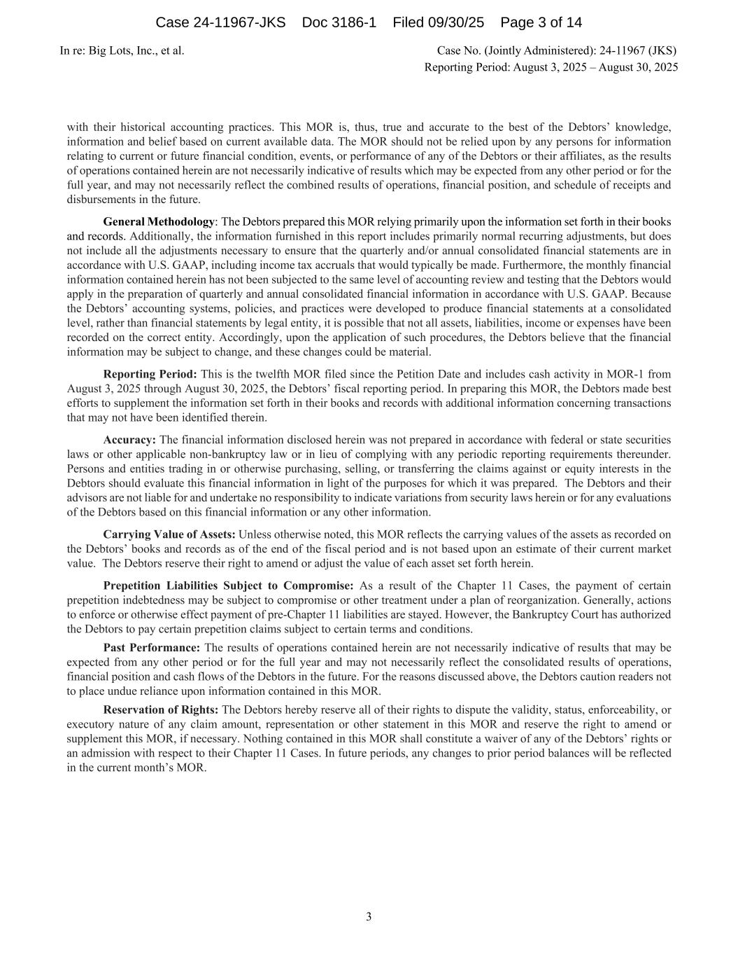 In re: Big Lots, Inc., et al. Case No. (Jointly Administered): 24-11967 (JKS) Reporting Period: August 3, 2025 – August 30, 2025 3 with their historical accounting practices. This MOR is, thus, true and accurate to the best of the Debtors’ knowledge, information and belief based on current available data. The MOR should not be relied upon by any persons for information relating to current or future financial condition, events, or performance of any of the Debtors or their affiliates, as the results of operations contained herein are not necessarily indicative of results which may be expected from any other period or for the full year, and may not necessarily reflect the combined results of operations, financial position, and schedule of receipts and disbursements in the future. General Methodology: The Debtors prepared this MOR relying primarily upon the information set forth in their books and records. Additionally, the information furnished in this report includes primarily normal recurring adjustments, but does not include all the adjustments necessary to ensure that the quarterly and/or annual consolidated financial statements are in accordance with U.S. GAAP, including income tax accruals that would typically be made. Furthermore, the monthly financial information contained herein has not been subjected to the same level of accounting review and testing that the Debtors would apply in the preparation of quarterly and annual consolidated financial information in accordance with U.S. GAAP. Because the Debtors’ accounting systems, policies, and practices were developed to produce financial statements at a consolidated level, rather than financial statements by legal entity, it is possible that not all assets, liabilities, income or expenses have been recorded on the correct entity. Accordingly, upon the application of such procedures, the Debtors believe that the financial information may be subject to change, and these changes could be material. Reporting Period: This is the twelfth MOR filed since the Petition Date and includes cash activity in MOR-1 from August 3, 2025 through August 30, 2025, the Debtors’ fiscal reporting period. In preparing this MOR, the Debtors made best efforts to supplement the information set forth in their books and records with additional information concerning transactions that may not have been identified therein. Accuracy: The financial information disclosed herein was not prepared in accordance with federal or state securities laws or other applicable non-bankruptcy law or in lieu of complying with any periodic reporting requirements thereunder. Persons and entities trading in or otherwise purchasing, selling, or transferring the claims against or equity interests in the Debtors should evaluate this financial information in light of the purposes for which it was prepared. The Debtors and their advisors are not liable for and undertake no responsibility to indicate variations from security laws herein or for any evaluations of the Debtors based on this financial information or any other information. Carrying Value of Assets: Unless otherwise noted, this MOR reflects the carrying values of the assets as recorded on the Debtors’ books and records as of the end of the fiscal period and is not based upon an estimate of their current market value. The Debtors reserve their right to amend or adjust the value of each asset set forth herein. Prepetition Liabilities Subject to Compromise: As a result of the Chapter 11 Cases, the payment of certain prepetition indebtedness may be subject to compromise or other treatment under a plan of reorganization. Generally, actions to enforce or otherwise effect payment of pre-Chapter 11 liabilities are stayed. However, the Bankruptcy Court has authorized the Debtors to pay certain prepetition claims subject to certain terms and conditions. Past Performance: The results of operations contained herein are not necessarily indicative of results that may be expected from any other period or for the full year and may not necessarily reflect the consolidated results of operations, financial position and cash flows of the Debtors in the future. For the reasons discussed above, the Debtors caution readers not to place undue reliance upon information contained in this MOR. Reservation of Rights: The Debtors hereby reserve all of their rights to dispute the validity, status, enforceability, or executory nature of any claim amount, representation or other statement in this MOR and reserve the right to amend or supplement this MOR, if necessary. Nothing contained in this MOR shall constitute a waiver of any of the Debtors’ rights or an admission with respect to their Chapter 11 Cases. In future periods, any changes to prior period balances will be reflected in the current month’s MOR. Case 24-11967-JKS Doc 3186-1 Filed 09/30/25 Page 3 of 14