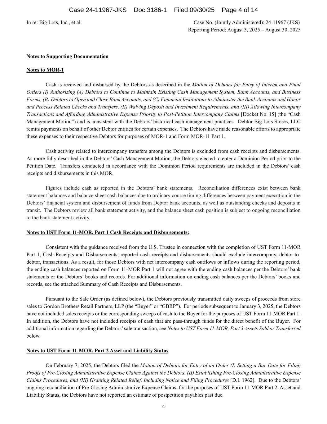 In re: Big Lots, Inc., et al. Case No. (Jointly Administered): 24-11967 (JKS) Reporting Period: August 3, 2025 – August 30, 2025 4 Notes to Supporting Documentation Notes to MOR-1 Cash is received and disbursed by the Debtors as described in the Motion of Debtors for Entry of Interim and Final Orders (I) Authorizing (A) Debtors to Continue to Maintain Existing Cash Management System, Bank Accounts, and Business Forms, (B) Debtors to Open and Close Bank Accounts, and (C) Financial Institutions to Administer the Bank Accounts and Honor and Process Related Checks and Transfers, (II) Waiving Deposit and Investment Requirements, and (III) Allowing Intercompany Transactions and Affording Administrative Expense Priority to Post-Petition Intercompany Claims [Docket No. 15] (the “Cash Management Motion”) and is consistent with the Debtors’ historical cash management practices. Debtor Big Lots Stores, LLC remits payments on behalf of other Debtor entities for certain expenses. The Debtors have made reasonable efforts to appropriate these expenses to their respective Debtors for purposes of MOR-1 and Form MOR-11 Part 1. Cash activity related to intercompany transfers among the Debtors is excluded from cash receipts and disbursements. As more fully described in the Debtors’ Cash Management Motion, the Debtors elected to enter a Dominion Period prior to the Petition Date. Transfers conducted in accordance with the Dominion Period requirements are included in the Debtors’ cash receipts and disbursements in this MOR. Figures include cash as reported in the Debtors’ bank statements. Reconciliation differences exist between bank statement balances and balance sheet cash balances due to ordinary course timing differences between payment execution in the Debtors’ financial system and disbursement of funds from Debtor bank accounts, as well as outstanding checks and deposits in transit. The Debtors review all bank statement activity, and the balance sheet cash position is subject to ongoing reconciliation to the bank statement activity. Notes to UST Form 11-MOR, Part 1 Cash Receipts and Disbursements: Consistent with the guidance received from the U.S. Trustee in connection with the completion of UST Form 11-MOR Part 1, Cash Receipts and Disbursements, reported cash receipts and disbursements should exclude intercompany, debtor-to- debtor, transactions. As a result, for those Debtors with net intercompany cash outflows or inflows during the reporting period, the ending cash balances reported on Form 11-MOR Part 1 will not agree with the ending cash balances per the Debtors’ bank statements or the Debtors’ books and records. For additional information on ending cash balances per the Debtors’ books and records, see the attached Summary of Cash Receipts and Disbursements. Pursuant to the Sale Order (as defined below), the Debtors previously transmitted daily sweeps of proceeds from store sales to Gordon Brothers Retail Partners, LLP (the “Buyer” or “GBRP”). For periods subsequent to January 3, 2025, the Debtors have not included sales receipts or the corresponding sweeps of cash to the Buyer for the purposes of UST Form 11-MOR Part 1. In addition, the Debtors have not included receipts of cash that are pass-through funds for the direct benefit of the Buyer. For additional information regarding the Debtors’ sale transaction, see Notes to UST Form 11-MOR, Part 3 Assets Sold or Transferred below. Notes to UST Form 11-MOR, Part 2 Asset and Liability Status On February 7, 2025, the Debtors filed the Motion of Debtors for Entry of an Order (I) Setting a Bar Date for Filing Proofs of Pre-Closing Administrative Expense Claims Against the Debtors, (II) Establishing Pre-Closing Administrative Expense Claims Procedures, and (III) Granting Related Relief, Including Notice and Filing Procedures [D.I. 1962]. Due to the Debtors’ ongoing reconciliation of Pre-Closing Administrative Expense Claims, for the purposes of UST Form 11-MOR Part 2, Asset and Liability Status, the Debtors have not reported an estimate of postpetition payables past due. Case 24-11967-JKS Doc 3186-1 Filed 09/30/25 Page 4 of 14