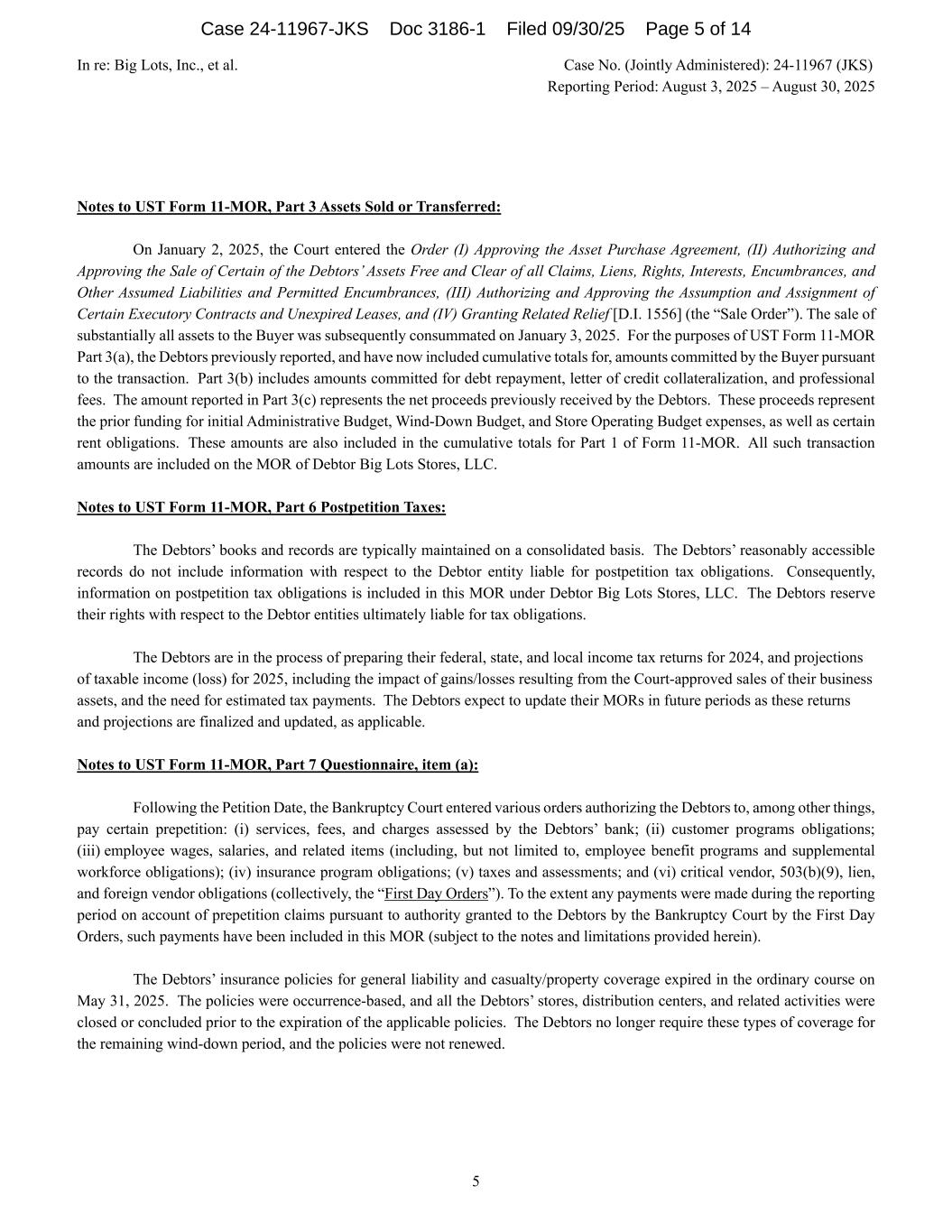 In re: Big Lots, Inc., et al. Case No. (Jointly Administered): 24-11967 (JKS) Reporting Period: August 3, 2025 – August 30, 2025 5 Notes to UST Form 11-MOR, Part 3 Assets Sold or Transferred: On January 2, 2025, the Court entered the Order (I) Approving the Asset Purchase Agreement, (II) Authorizing and Approving the Sale of Certain of the Debtors’ Assets Free and Clear of all Claims, Liens, Rights, Interests, Encumbrances, and Other Assumed Liabilities and Permitted Encumbrances, (III) Authorizing and Approving the Assumption and Assignment of Certain Executory Contracts and Unexpired Leases, and (IV) Granting Related Relief [D.I. 1556] (the “Sale Order”). The sale of substantially all assets to the Buyer was subsequently consummated on January 3, 2025. For the purposes of UST Form 11-MOR Part 3(a), the Debtors previously reported, and have now included cumulative totals for, amounts committed by the Buyer pursuant to the transaction. Part 3(b) includes amounts committed for debt repayment, letter of credit collateralization, and professional fees. The amount reported in Part 3(c) represents the net proceeds previously received by the Debtors. These proceeds represent the prior funding for initial Administrative Budget, Wind-Down Budget, and Store Operating Budget expenses, as well as certain rent obligations. These amounts are also included in the cumulative totals for Part 1 of Form 11-MOR. All such transaction amounts are included on the MOR of Debtor Big Lots Stores, LLC. Notes to UST Form 11-MOR, Part 6 Postpetition Taxes: The Debtors’ books and records are typically maintained on a consolidated basis. The Debtors’ reasonably accessible records do not include information with respect to the Debtor entity liable for postpetition tax obligations. Consequently, information on postpetition tax obligations is included in this MOR under Debtor Big Lots Stores, LLC. The Debtors reserve their rights with respect to the Debtor entities ultimately liable for tax obligations. The Debtors are in the process of preparing their federal, state, and local income tax returns for 2024, and projections of taxable income (loss) for 2025, including the impact of gains/losses resulting from the Court-approved sales of their business assets, and the need for estimated tax payments. The Debtors expect to update their MORs in future periods as these returns and projections are finalized and updated, as applicable. Notes to UST Form 11-MOR, Part 7 Questionnaire, item (a): Following the Petition Date, the Bankruptcy Court entered various orders authorizing the Debtors to, among other things, pay certain prepetition: (i) services, fees, and charges assessed by the Debtors’ bank; (ii) customer programs obligations; (iii) employee wages, salaries, and related items (including, but not limited to, employee benefit programs and supplemental workforce obligations); (iv) insurance program obligations; (v) taxes and assessments; and (vi) critical vendor, 503(b)(9), lien, and foreign vendor obligations (collectively, the “First Day Orders”). To the extent any payments were made during the reporting period on account of prepetition claims pursuant to authority granted to the Debtors by the Bankruptcy Court by the First Day Orders, such payments have been included in this MOR (subject to the notes and limitations provided herein). The Debtors’ insurance policies for general liability and casualty/property coverage expired in the ordinary course on May 31, 2025. The policies were occurrence-based, and all the Debtors’ stores, distribution centers, and related activities were closed or concluded prior to the expiration of the applicable policies. The Debtors no longer require these types of coverage for the remaining wind-down period, and the policies were not renewed. Case 24-11967-JKS Doc 3186-1 Filed 09/30/25 Page 5 of 14