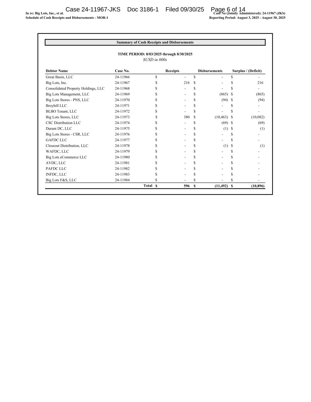 In re: Big Lots, Inc., et al. Schedule of Cash Receipts and Disbursements - MOR-1 Case No (Jointly Administered): 24-11967 (JKS) Reporting Period: August 3, 2025 - August 30, 2025 Summary of Cash Receipts and Disbursements TIME PERIOD: 8/03/2025 through 8/30/2025 Debtor Name Case No. Receipts Disbursements Surplus / (Deficit) Great Basin, LLC 24-11966 -$ -$ -$ Big Lots, Inc. 24-11967 216$ -$ 216$ Consolidated Property Holdings, LLC 24-11968 -$ -$ -$ Big Lots Management, LLC 24-11969 -$ (865)$ (865)$ Big Lots Stores - PNS, LLC 24-11970 -$ (94)$ (94)$ Broyhill LLC 24-11971 -$ -$ -$ BLBO Tenant, LLC 24-11972 -$ -$ -$ Big Lots Stores, LLC 24-11973 380$ (10,463)$ (10,082)$ CSC Distribution LLC 24-11974 -$ (69)$ (69)$ Durant DC, LLC 24-11975 -$ (1)$ (1)$ Big Lots Stores - CSR, LLC 24-11976 -$ -$ -$ GAFDC LLC 24-11977 -$ -$ -$ Closeout Distribution, LLC 24-11978 -$ (1)$ (1)$ WAFDC, LLC 24-11979 -$ -$ -$ Big Lots eCommerce LLC 24-11980 -$ -$ -$ AVDC, LLC 24-11981 -$ -$ -$ PAFDC LLC 24-11982 -$ -$ -$ INFDC, LLC 24-11983 -$ -$ -$ Big Lots F&S, LLC 24-11984 -$ -$ -$ Total 596$ (11,492)$ (10,896)$ $USD in 000s Case 24-11967-JKS Doc 3186-1 Filed 09/30/25 Page 6 of 14