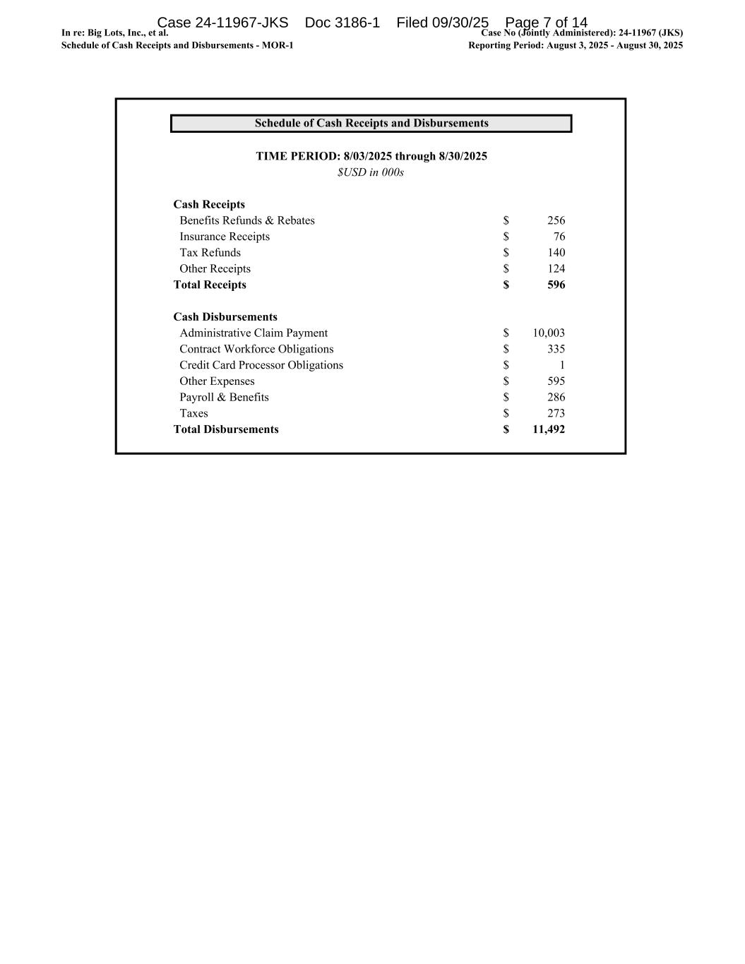 In re: Big Lots, Inc., et al. Schedule of Cash Receipts and Disbursements - MOR-1 Case No (Jointly Administered): 24-11967 (JKS) Reporting Period: August 3, 2025 - August 30, 2025 Schedule of Cash Receipts and Disbursements TIME PERIOD: 8/03/2025 through 8/30/2025 Cash Receipts Benefits Refunds & Rebates 256$ Insurance Receipts 76$ Tax Refunds 140$ Other Receipts 124$ Total Receipts 596$ Cash Disbursements Administrative Claim Payment 10,003$ Contract Workforce Obligations 335$ Credit Card Processor Obligations 1$ Other Expenses 595$ Payroll & Benefits 286$ Taxes 273$ Total Disbursements 11,492$ $USD in 000s Case 24-11967-JKS Doc 3186-1 Filed 09/30/25 Page 7 of 14