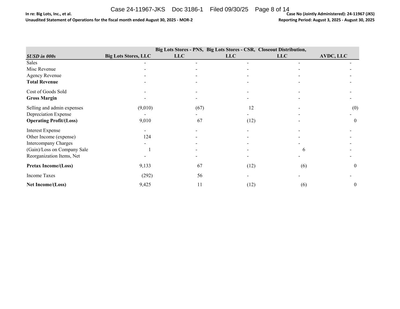 In re: Big Lots, Inc., et al. Unaudited Statement of Operations for the fiscal month ended August 30, 2025 - MOR-2 Case No (Jointly Administered): 24-11967 (JKS) Reporting Period: August 3, 2025 - August 30, 2025 $USD in 000s Big Lots Stores, LLC Big Lots Stores - PNS, LLC Big Lots Stores - CSR, LLC Closeout Distribution, LLC AVDC, LLC Sales - - - - - Misc Revenue - - - - - Agency Revenue - - - - - Total Revenue - - - - - Cost of Goods Sold - - - - - Gross Margin - - - - - Selling and admin expenses (9,010) (67) 12 - (0) Depreciation Expense - - - - - Operating Profit/(Loss) 9,010 67 (12) - 0 Interest Expense - - - - - Other Income (expense) 124 - - - - Intercompany Charges - - - - - (Gain)/Loss on Company Sale 1 - - 6 - Reorganization Items, Net - - - - - Pretax Income/(Loss) 9,133 67 (12) (6) 0 Income Taxes (292) 56 - - - Net Income/(Loss) 9,425 11 (12) (6) 0 Case 24-11967-JKS Doc 3186-1 Filed 09/30/25 Page 8 of 14