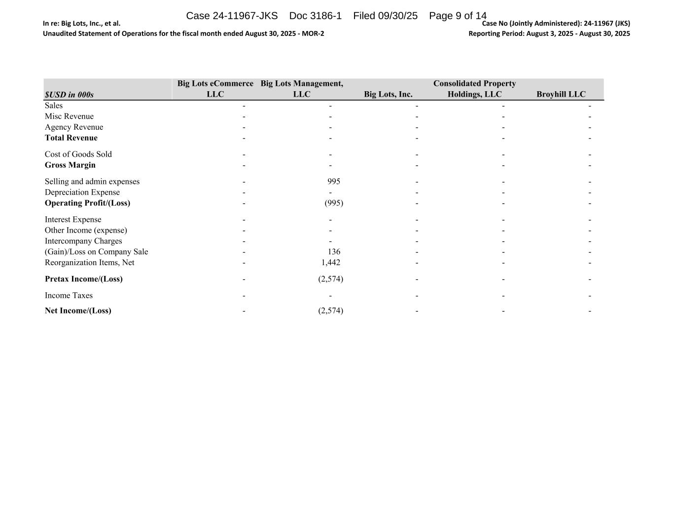 In re: Big Lots, Inc., et al. Unaudited Statement of Operations for the fiscal month ended August 30, 2025 - MOR-2 Case No (Jointly Administered): 24-11967 (JKS) Reporting Period: August 3, 2025 - August 30, 2025 $USD in 000s Sales Misc Revenue Agency Revenue Total Revenue Cost of Goods Sold Gross Margin Selling and admin expenses Depreciation Expense Operating Profit/(Loss) Interest Expense Other Income (expense) Intercompany Charges (Gain)/Loss on Company Sale Reorganization Items, Net Pretax Income/(Loss) Income Taxes Net Income/(Loss) Big Lots eCommerce LLC Big Lots Management, LLC Big Lots, Inc. Consolidated Property Holdings, LLC Broyhill LLC - - - - - - - - - - - - - - - - - - - - - - - - - - - - - - - 995 - - - - - - - - - (995) - - - - - - - - - - - - - - - - - - - 136 - - - - 1,442 - - - - (2,574) - - - - - - - - - (2,574) - - - Case 24-11967-JKS Doc 3186-1 Filed 09/30/25 Page 9 of 14
