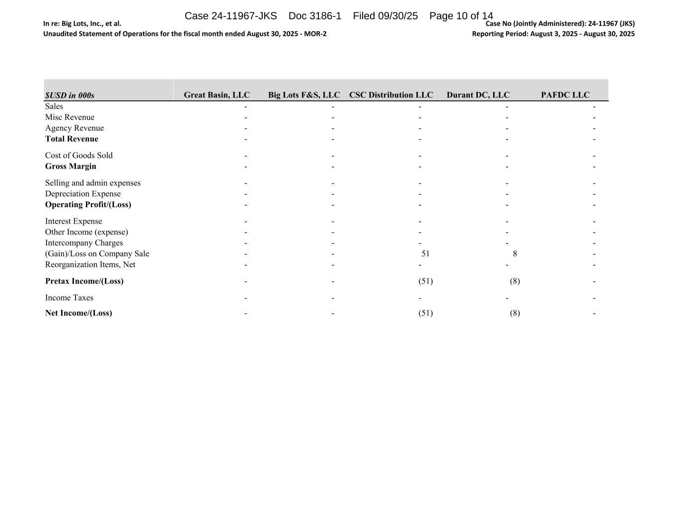 In re: Big Lots, Inc., et al. Unaudited Statement of Operations for the fiscal month ended August 30, 2025 - MOR-2 Case No (Jointly Administered): 24-11967 (JKS) Reporting Period: August 3, 2025 - August 30, 2025 $USD in 000s Sales Misc Revenue Agency Revenue Total Revenue Cost of Goods Sold Gross Margin Selling and admin expenses Depreciation Expense Operating Profit/(Loss) Interest Expense Other Income (expense) Intercompany Charges (Gain)/Loss on Company Sale Reorganization Items, Net Pretax Income/(Loss) Income Taxes Net Income/(Loss) Great Basin, LLC Big Lots F&S, LLC CSC Distribution LLC Durant DC, LLC PAFDC LLC - - - - - - - - - - - - - - - - - - - - - - - - - - - - - - - - - - - - - - - - - - - - - - - - - - - - - - - - - - - - - - 51 8 - - - - - - - - (51) (8) - - - - - - - - (51) (8) - Case 24-11967-JKS Doc 3186-1 Filed 09/30/25 Page 10 of 14