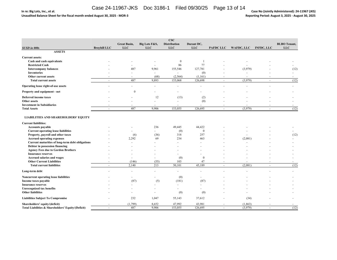 In re: Big Lots, Inc., et al. Unaudited Balance Sheet for the fiscal month ended August 30, 2025 - MOR-3 Case No (Jointly Administered): 24-11967 (JKS) Reporting Period: August 3, 2025 - August 30, 2025 $USD in 000s ASSETS Current assets: Cash and cash equivalents Restricted Cash Intercompany balances Inventories Other current assets Total current assets Operating lease right-of-use assets Property and equipment - net Deferred income taxes Other assets Investment in Subsidiaries Total Assets LIABILITIES AND SHAREHOLDERS' EQUITY Current liabilities: Accounts payable Current operating lease liabilities Property, payroll and other taxes Accrued operating expenses Current maturities of long-term debt obligations Debtor in possession financing Agency Fees due to Gordon Brothers Insurance reserves Accrued salaries and wages Other Current Liabilities Total current liabilities Long-term debt Noncurrent operating lease liabilities Income taxes payable Insurance reserves Unrecognized tax benefits Other liabilities Liabilities Subject To Compromise Shareholders' equity/(deficit) Total Liabilities & Shareholders' Equity/(Deficit) Broyhill LLC Great Basin, LLC Big Lots F&S, LLC CSC Distribution LLC Durant DC, LLC PAFDC LLC WAFDC, LLC INFDC, LLC BLBO Tenant, LLC - - - 0 1 - - - - - - - 86 77 - - - - - 487 9,961 155,546 127,781 - (3,979) - (12) - - - - (0) - - - - - - (68) (2,564) (1,161) - - - - - 487 9,893 153,068 126,698 - (3,979) - (12) - - - - - - - - - - 0 - - - - - - - - - 12 (13) (2) - - - - - - - - (0) - - - - - - - - - - - - - - 487 9,906 153,055 126,695 - (3,979) - (12) - - 236 49,445 44,422 - - - - - - - (0) 0 - - - - - (6) (36) 318 257 - - - (12) - 2,292 69 234 463 - (2,081) - - - - - - - - - - - - - - - - - - - - - - - - - - - - - - - - - - - - - - - - - (0) 0 - - - - - (146) (55) 103 47 - - - - - 2,140 213 50,101 45,189 - (2,081) - (12) - - - - - - - - - - - - (0) - - - - - - (87) (5) (181) (87) - - - - - - - - - - - - - - - - - - - - - - - - - (0) (0) - - - - - 232 1,047 55,143 37,612 - (34) - - - (1,799) 8,652 47,992 43,981 - (1,863) - - - 487 9,906 153,055 126,695 - (3,979) - (12) Case 24-11967-JKS Doc 3186-1 Filed 09/30/25 Page 13 of 14