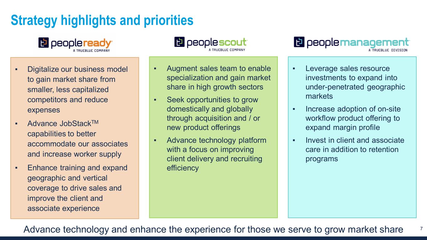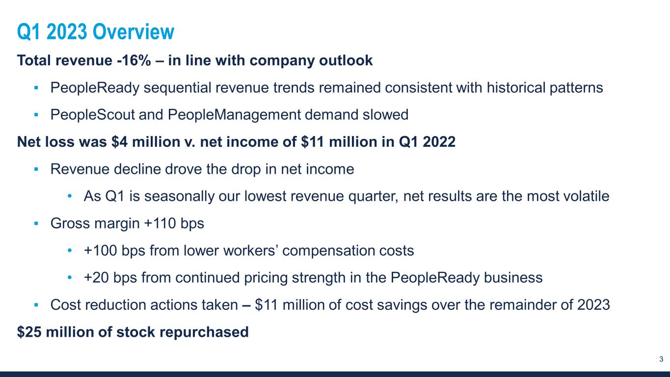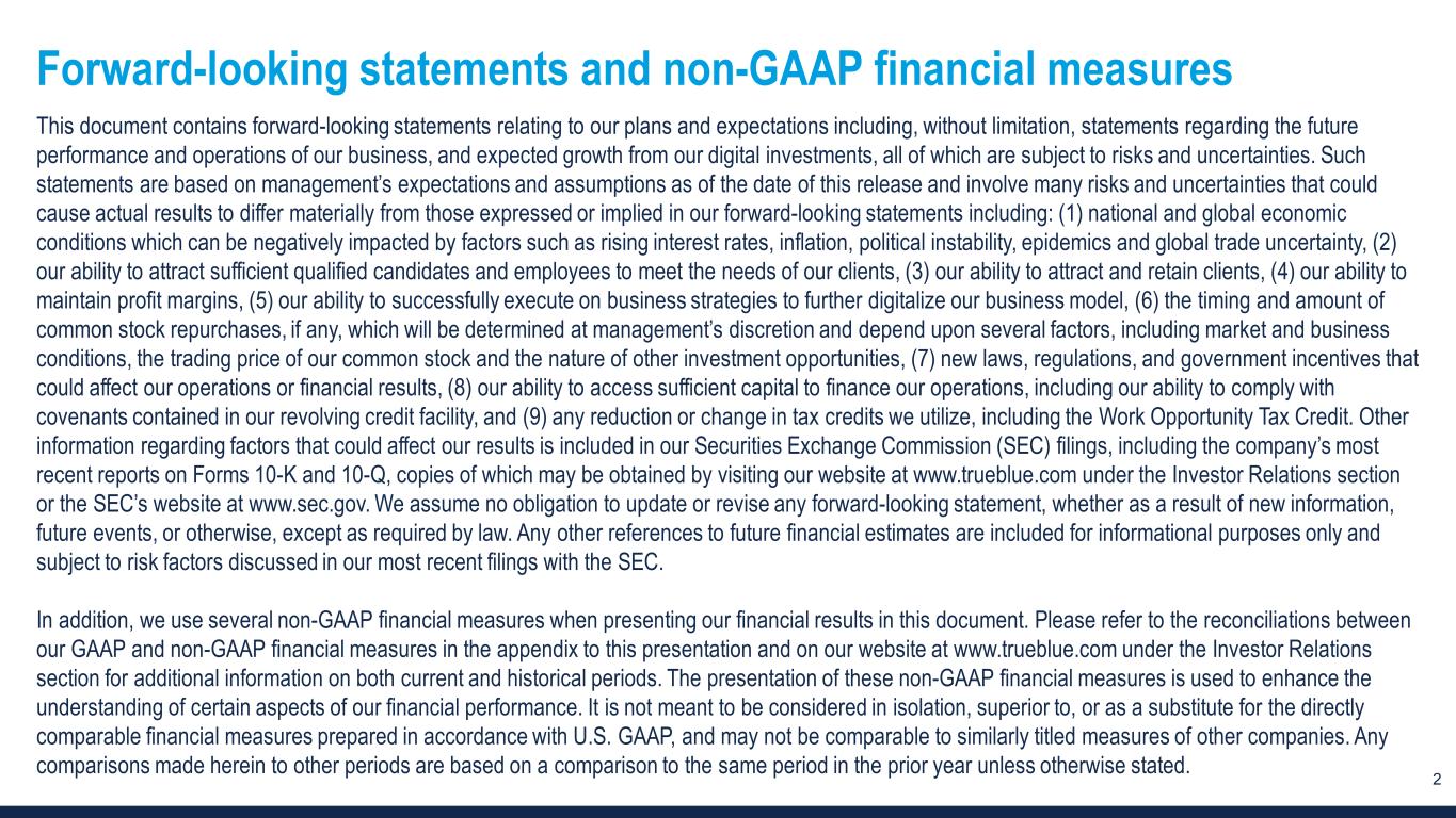 2 Forward-looking statements and non-GAAP financial measures This document contains forward-looking statements relating to our plans and expectations including, without limitation, statements regarding the future performance and operations of our business, and expected growth from our digital investments, all of which are subject to risks and uncertainties. Such statements are based on management’s expectations and assumptions as of the date of this release and involve many risks and uncertainties that could cause actual results to differ materially from those expressed or implied in our forward-looking statements including: (1) national and global economic conditions which can be negatively impacted by factors such as rising interest rates, inflation, political instability, epidemics and global trade uncertainty, (2) our ability to attract sufficient qualified candidates and employees to meet the needs of our clients, (3) our ability to attract and retain clients, (4) our ability to maintain profit margins, (5) our ability to successfully execute on business strategies to further digitalize our business model, (6) the timing and amount of common stock repurchases, if any, which will be determined at management’s discretion and depend upon several factors, including market and business conditions, the trading price of our common stock and the nature of other investment opportunities, (7) new laws, regulations, and government incentives that could affect our operations or financial results, (8) our ability to access sufficient capital to finance our operations, including our ability to comply with covenants contained in our revolving credit facility, and (9) any reduction or change in tax credits we utilize, including the Work Opportunity Tax Credit. Other information regarding factors that could affect our results is included in our Securities Exchange Commission (SEC) filings, including the company’s most recent reports on Forms 10-K and 10-Q, copies of which may be obtained by visiting our website at www.trueblue.com under the Investor Relations section or the SEC’s website at www.sec.gov. We assume no obligation to update or revise any forward-looking statement, whether as a result of new information, future events, or otherwise, except as required by law. Any other references to future financial estimates are included for informational purposes only and subject to risk factors discussed in our most recent filings with the SEC. In addition, we use several non-GAAP financial measures when presenting our financial results in this document. Please refer to the reconciliations between our GAAP and non-GAAP financial measures in the appendix to this presentation and on our website at www.trueblue.com under the Investor Relations section for additional information on both current and historical periods. The presentation of these non-GAAP financial measures is used to enhance the understanding of certain aspects of our financial performance. It is not meant to be considered in isolation, superior to, or as a substitute for the directly comparable financial measures prepared in accordance with U.S. GAAP, and may not be comparable to similarly titled measures of other companies. Any comparisons made herein to other periods are based on a comparison to the same period in the prior year unless otherwise stated.