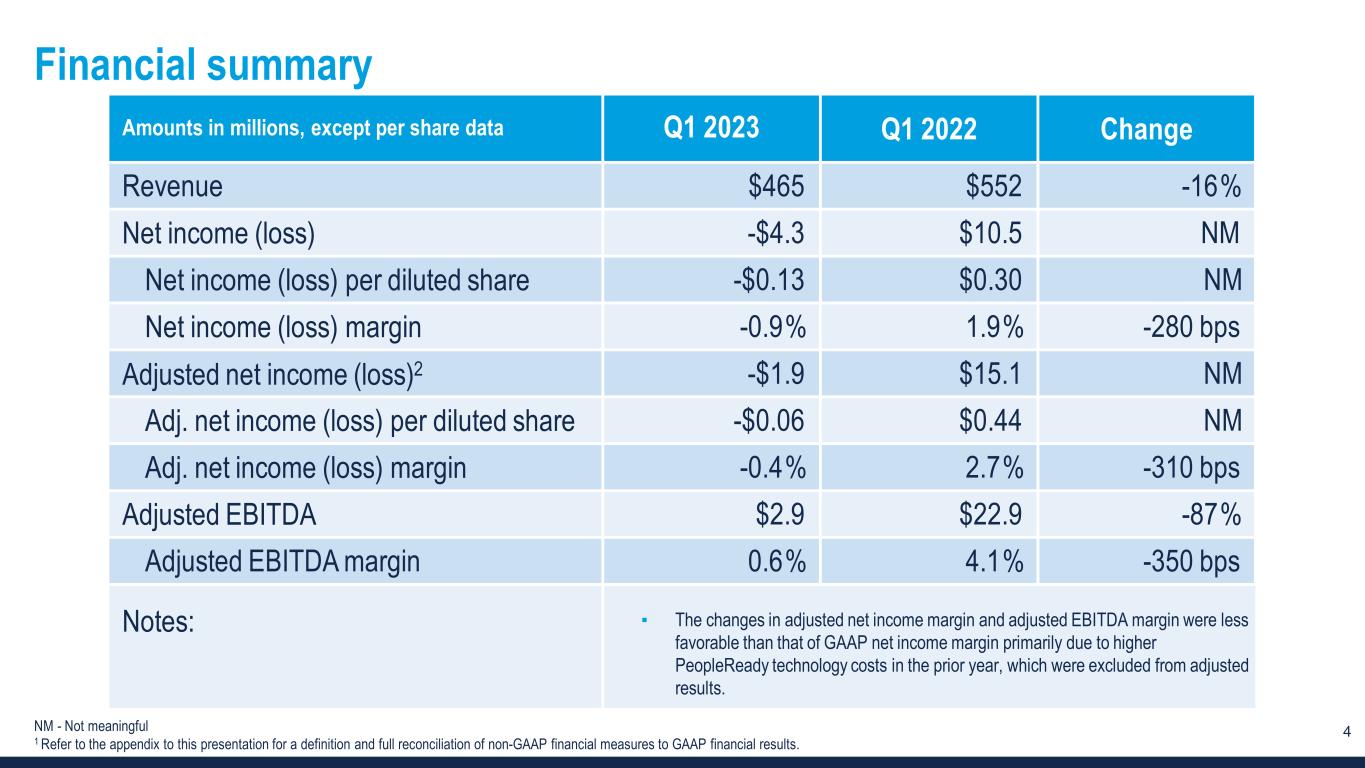 3 Q1 2023 Overview Total revenue -16% – in line with company outlook ▪ PeopleReady sequential revenue trends remained consistent with historical patterns ▪ PeopleScout and PeopleManagement demand slowed Net loss was $4 million v. net income of $11 million in Q1 2022 ▪ Revenue decline drove the drop in net income • As Q1 is seasonally our lowest revenue quarter, net results are the most volatile ▪ Gross margin +110 bps • +100 bps from lower workers’ compensation costs • +20 bps from continued pricing strength in the PeopleReady business ▪ Cost reduction actions taken – $11 million of cost savings over the remainder of 2023 $25 million of stock repurchased