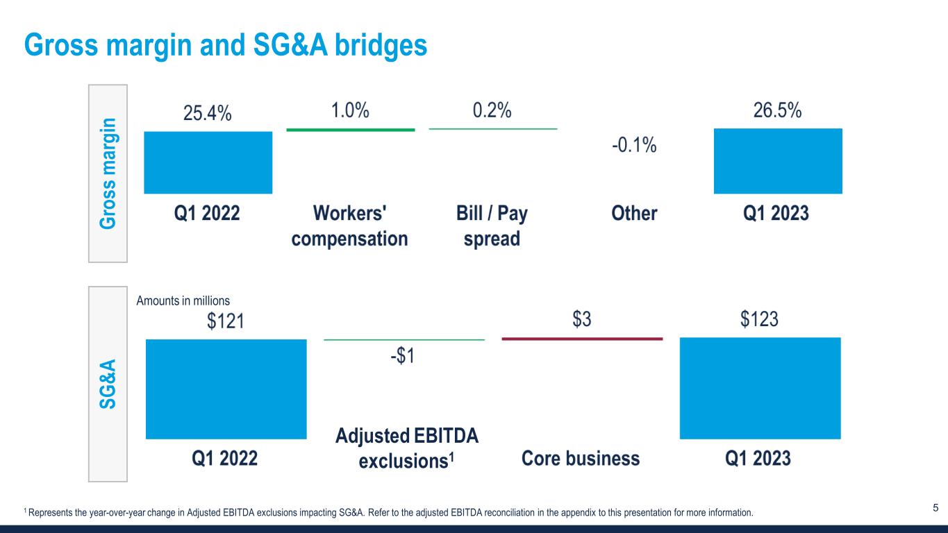 4 Financial summary Amounts in millions, except per share data Q1 2023 Q1 2022 Change Revenue $465 $552 -16% Net income (loss) -$4.3 $10.5 NM Net income (loss) per diluted share -$0.13 $0.30 NM Net income (loss) margin -0.9% 1.9% -280 bps Adjusted net income (loss)2 -$1.9 $15.1 NM Adj. net income (loss) per diluted share -$0.06 $0.44 NM Adj. net income (loss) margin -0.4% 2.7% -310 bps Adjusted EBITDA $2.9 $22.9 -87% Adjusted EBITDA margin 0.6% 4.1% -350 bps Notes: ▪ The changes in adjusted net income margin and adjusted EBITDA margin were less favorable than that of GAAP net income margin primarily due to higher PeopleReady technology costs in the prior year, which were excluded from adjusted results. NM - Not meaningful 1 Refer to the appendix to this presentation for a definition and full reconciliation of non-GAAP financial measures to GAAP financial results.