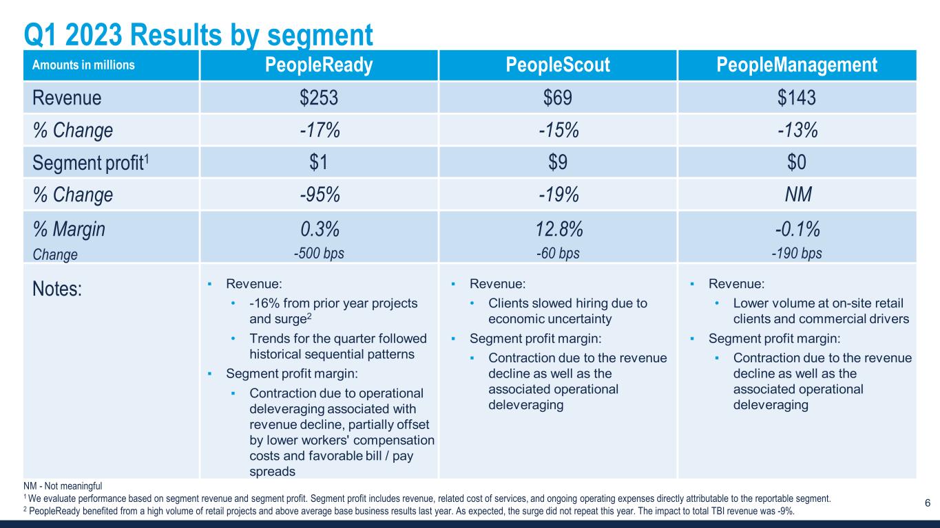 6 Q1 2023 Results by segment Amounts in millions PeopleReady PeopleScout PeopleManagement Revenue $253 $69 $143 % Change -17% -15% -13% Segment profit1 $1 $9 $0 % Change -95% -19% NM % Margin 0.3% 12.8% -0.1% Change -500 bps -60 bps -190 bps Notes: ▪ Revenue: • -16% from prior year projects and surge2 • Trends for the quarter followed historical sequential patterns ▪ Segment profit margin: ▪ Contraction due to operational deleveraging associated with revenue decline, partially offset by lower workers' compensation costs and favorable bill / pay spreads ▪ Revenue: • Clients slowed hiring due to economic uncertainty ▪ Segment profit margin: ▪ Contraction due to the revenue decline as well as the associated operational deleveraging ▪ Revenue: • Lower volume at on-site retail clients and commercial drivers ▪ Segment profit margin: ▪ Contraction due to the revenue decline as well as the associated operational deleveraging NM - Not meaningful 1 We evaluate performance based on segment revenue and segment profit. Segment profit includes revenue, related cost of services, and ongoing operating expenses directly attributable to the reportable segment. 2 PeopleReady benefited from a high volume of retail projects and above average base business results last year. As expected, the surge did not repeat this year. The impact to total TBI revenue was -9%.