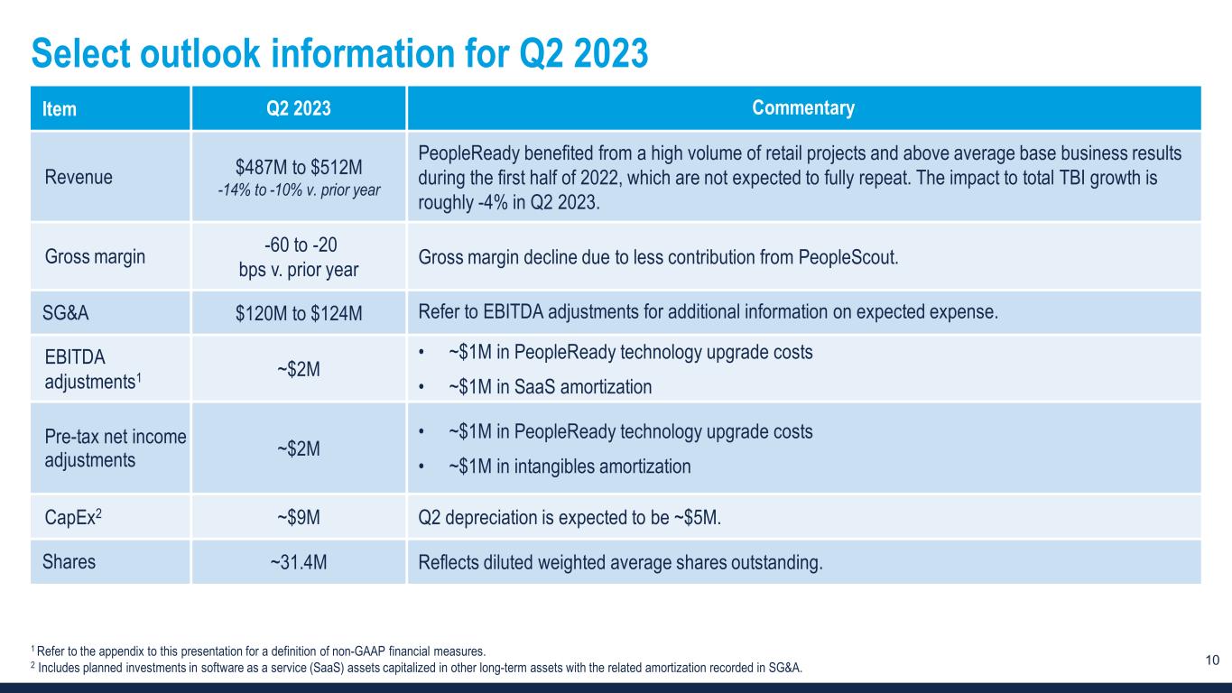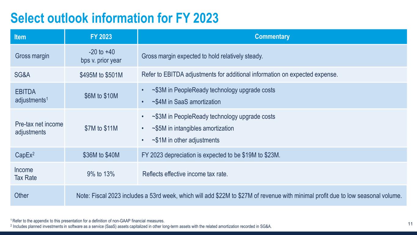 10 Select outlook information for Q2 2023 Item Q2 2023 Commentary Revenue $487M to $512M -14% to -10% v. prior year PeopleReady benefited from a high volume of retail projects and above average base business results during the first half of 2022, which are not expected to fully repeat. The impact to total TBI growth is roughly -4% in Q2 2023. Gross margin -60 to -20 bps v. prior year Gross margin decline due to less contribution from PeopleScout. SG&A $120M to $124M Refer to EBITDA adjustments for additional information on expected expense. EBITDA adjustments1 ~$2M • ~$1M in PeopleReady technology upgrade costs • ~$1M in SaaS amortization Pre-tax net income adjustments ~$2M • ~$1M in PeopleReady technology upgrade costs • ~$1M in intangibles amortization CapEx2 ~$9M Q2 depreciation is expected to be ~$5M. Shares ~31.4M Reflects diluted weighted average shares outstanding. 1 Refer to the appendix to this presentation for a definition of non-GAAP financial measures. 2 Includes planned investments in software as a service (SaaS) assets capitalized in other long-term assets with the related amortization recorded in SG&A.