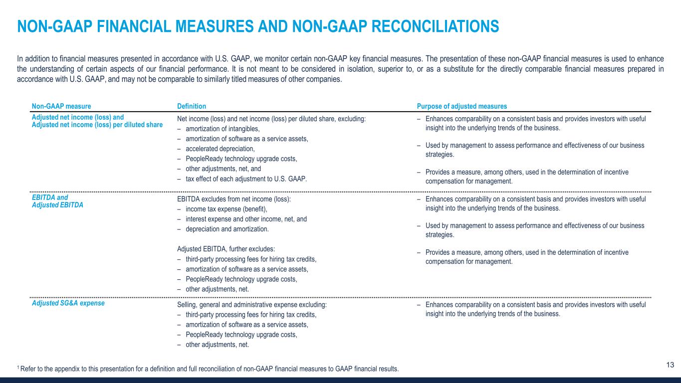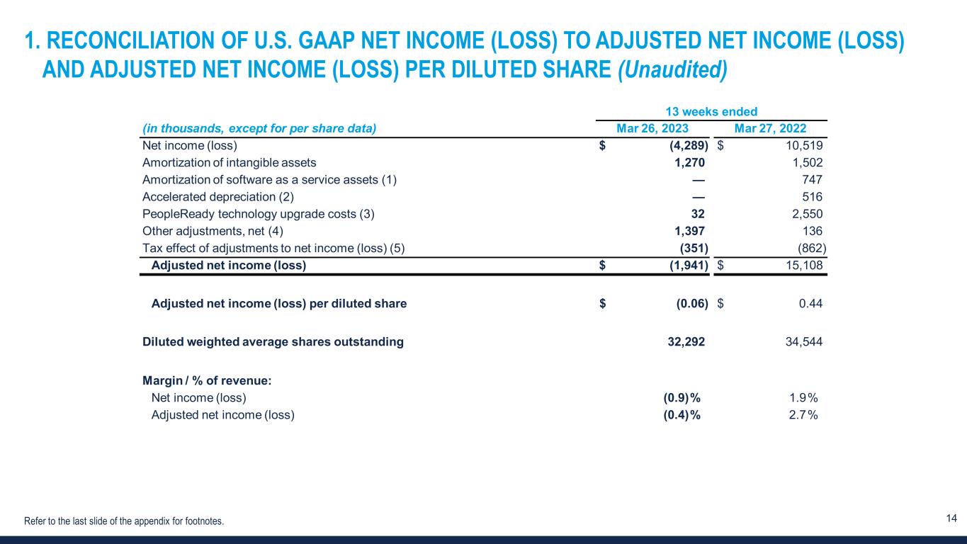 13 NON-GAAP FINANCIAL MEASURES AND NON-GAAP RECONCILIATIONS 1 Refer to the appendix to this presentation for a definition and full reconciliation of non-GAAP financial measures to GAAP financial results. In addition to financial measures presented in accordance with U.S. GAAP, we monitor certain non-GAAP key financial measures. The presentation of these non-GAAP financial measures is used to enhance the understanding of certain aspects of our financial performance. It is not meant to be considered in isolation, superior to, or as a substitute for the directly comparable financial measures prepared in accordance with U.S. GAAP, and may not be comparable to similarly titled measures of other companies. Non-GAAP measure Definition Purpose of adjusted measures Adjusted net income (loss) and Adjusted net income (loss) per diluted share Net income (loss) and net income (loss) per diluted share, excluding: – amortization of intangibles, – amortization of software as a service assets, – accelerated depreciation, – PeopleReady technology upgrade costs, – other adjustments, net, and – tax effect of each adjustment to U.S. GAAP. – Enhances comparability on a consistent basis and provides investors with useful insight into the underlying trends of the business. – Used by management to assess performance and effectiveness of our business strategies. – Provides a measure, among others, used in the determination of incentive compensation for management. EBITDA and Adjusted EBITDA EBITDA excludes from net income (loss): – income tax expense (benefit), – interest expense and other income, net, and – depreciation and amortization. Adjusted EBITDA, further excludes: – third-party processing fees for hiring tax credits, – amortization of software as a service assets, – PeopleReady technology upgrade costs, – other adjustments, net. – Enhances comparability on a consistent basis and provides investors with useful insight into the underlying trends of the business. – Used by management to assess performance and effectiveness of our business strategies. – Provides a measure, among others, used in the determination of incentive compensation for management. Adjusted SG&A expense Selling, general and administrative expense excluding: – third-party processing fees for hiring tax credits, – amortization of software as a service assets, – PeopleReady technology upgrade costs, – other adjustments, net. – Enhances comparability on a consistent basis and provides investors with useful insight into the underlying trends of the business.