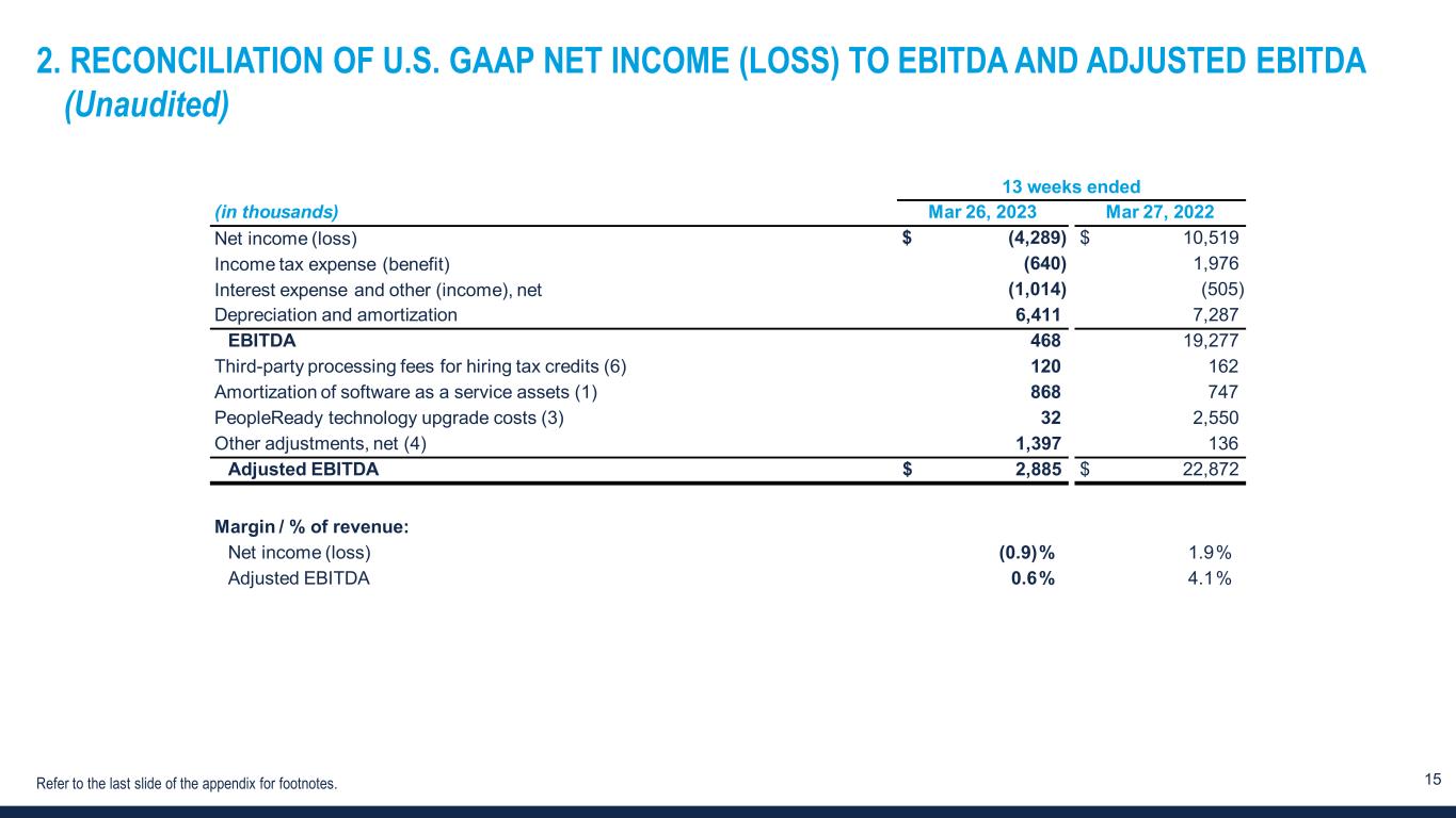 14 1. RECONCILIATION OF U.S. GAAP NET INCOME (LOSS) TO ADJUSTED NET INCOME (LOSS) AND ADJUSTED NET INCOME (LOSS) PER DILUTED SHARE (Unaudited) 13 weeks ended (in thousands, except for per share data) Mar 26, 2023 Mar 27, 2022 Net income (loss) $ (4,289) $ 10,519 Amortization of intangible assets 1,270 1,502 Amortization of software as a service assets (1) — 747 Accelerated depreciation (2) — 516 PeopleReady technology upgrade costs (3) 32 2,550 Other adjustments, net (4) 1,397 136 Tax effect of adjustments to net income (loss) (5) (351) (862) Adjusted net income (loss) $ (1,941) $ 15,108 Adjusted net income (loss) per diluted share $ (0.06) $ 0.44 Diluted weighted average shares outstanding 32,292 34,544 Margin / % of revenue: Net income (loss) (0.9)% 1.9% Adjusted net income (loss) (0.4)% 2.7% Refer to the last slide of the appendix for footnotes.