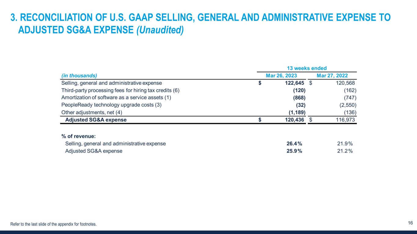 15 2. RECONCILIATION OF U.S. GAAP NET INCOME (LOSS) TO EBITDA AND ADJUSTED EBITDA (Unaudited) 13 weeks ended (in thousands) Mar 26, 2023 Mar 27, 2022 Net income (loss) $ (4,289) $ 10,519 Income tax expense (benefit) (640) 1,976 Interest expense and other (income), net (1,014) (505) Depreciation and amortization 6,411 7,287 EBITDA 468 19,277 Third-party processing fees for hiring tax credits (6) 120 162 Amortization of software as a service assets (1) 868 747 PeopleReady technology upgrade costs (3) 32 2,550 Other adjustments, net (4) 1,397 136 Adjusted EBITDA $ 2,885 $ 22,872 Margin / % of revenue: Net income (loss) (0.9)% 1.9% Adjusted EBITDA 0.6% 4.1% Refer to the last slide of the appendix for footnotes.