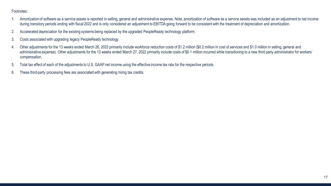 16 3. RECONCILIATION OF U.S. GAAP SELLING, GENERAL AND ADMINISTRATIVE EXPENSE TO ADJUSTED SG&A EXPENSE (Unaudited) 13 weeks ended (in thousands) Mar 26, 2023 Mar 27, 2022 Selling, general and administrative expense $ 122,645 $ 120,568 Third-party processing fees for hiring tax credits (6) (120) (162) Amortization of software as a service assets (1) (868) (747) PeopleReady technology upgrade costs (3) (32) (2,550) Other adjustments, net (4) (1,189) (136) Adjusted SG&A expense $ 120,436 $ 116,973 % of revenue: Selling, general and administrative expense 26.4% 21.9% Adjusted SG&A expense 25.9% 21.2% Refer to the last slide of the appendix for footnotes.