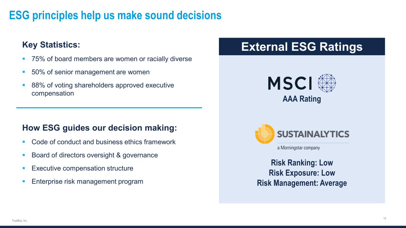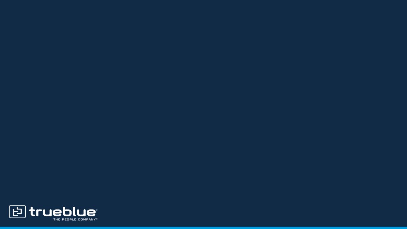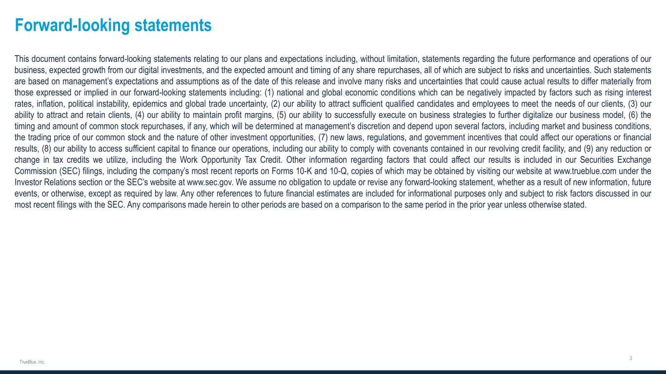 Forward-looking statements This document contains forward-looking statements relating to our plans and expectations including, without limitation, statements regarding the future performance and operations of our business, expected growth from our digital investments, and the expected amount and timing of any share repurchases, all of which are subject to risks and uncertainties. Such statements are based on management’s expectations and assumptions as of the date of this release and involve many risks and uncertainties that could cause actual results to differ materially from those expressed or implied in our forward-looking statements including: (1) national and global economic conditions which can be negatively impacted by factors such as rising interest rates, inflation, political instability, epidemics and global trade uncertainty, (2) our ability to attract sufficient qualified candidates and employees to meet the needs of our clients, (3) our ability to attract and retain clients, (4) our ability to maintain profit margins, (5) our ability to successfully execute on business strategies to further digitalize our business model, (6) the timing and amount of common stock repurchases, if any, which will be determined at management’s discretion and depend upon several factors, including market and business conditions, the trading price of our common stock and the nature of other investment opportunities, (7) new laws, regulations, and government incentives that could affect our operations or financial results, (8) our ability to access sufficient capital to finance our operations, including our ability to comply with covenants contained in our revolving credit facility, and (9) any reduction or change in tax credits we utilize, including the Work Opportunity Tax Credit. Other information regarding factors that could affect our results is included in our Securities Exchange Commission (SEC) filings, including the company’s most recent reports on Forms 10-K and 10-Q, copies of which may be obtained by visiting our website at www.trueblue.com under the Investor Relations section or the SEC’s website at www.sec.gov. We assume no obligation to update or revise any forward-looking statement, whether as a result of new information, future events, or otherwise, except as required by law. Any other references to future financial estimates are included for informational purposes only and subject to risk factors discussed in our most recent filings with the SEC. Any comparisons made herein to other periods are based on a comparison to the same period in the prior year unless otherwise stated.