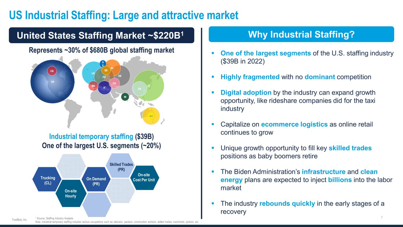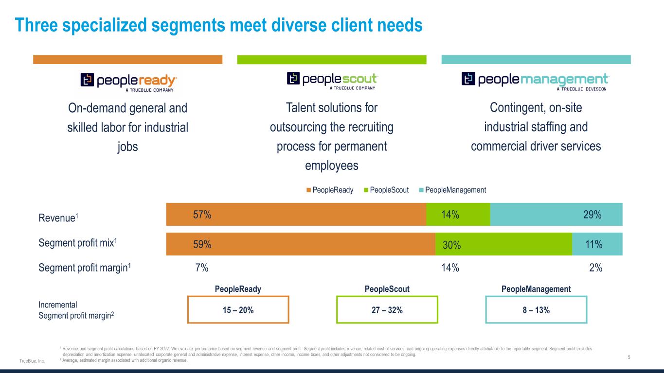 Leadership with deep industry experience Steve Cooper Director and CEO 20+ years of industry experience 12 years as TrueBlue CEO TrueBlue Director since 2006 Derrek Gafford EVP and CFO 20+ years of industry experience 19 years of CFO experience TrueBlue CFO since 2006 Taryn Owen President and COO 20+ years of industry experience 10 years as business leader TrueBlue President & COO since 2022