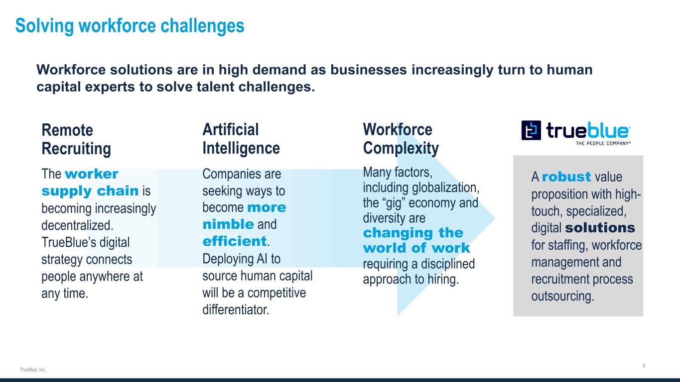 Solving workforce challenges Workforce Complexity Many factors, including globalization, the “gig” economy and diversity are changing the world of work requiring a disciplined approach to hiring. Artificial Intelligence Companies are seeking ways to become more nimble and efficient Deploying AI to source human capital will be a competitive differentiator. Remote Recruiting The worker supply chain is becoming increasingly decentralized. TrueBlue’s digital strategy connects people anywhere at any time. Workforce solutions are in high demand as businesses increasingly turn to human capital experts to solve talent challenges. A robust value proposition with high- touch, specialized, digital solutions for staffing, workforce management and recruitment process outsourcing.