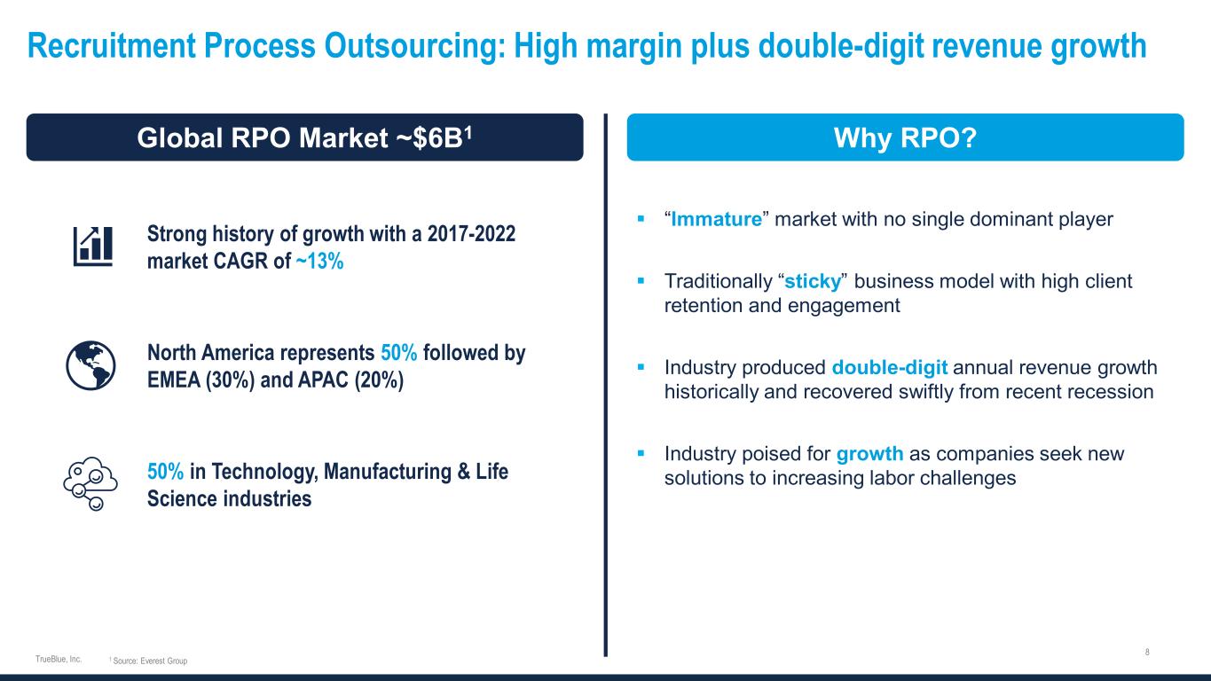 Recruitment Process Outsourcing: High margin plus double-digit revenue growth Global RPO Market ~$6B1 Why RPO?  “Immature” market with no single dominant player  Traditionally “sticky” business model with high client retention and engagement  Industry produced double-digit annual revenue growth historically and recovered swiftly from recent recession  Industry poised for growth as companies seek new solutions to increasing labor challenges Strong history of growth with a 2017-2022 market CAGR of ~13% 50% in Technology, Manufacturing & Life Science industries North America represents 50% followed by EMEA (30%) and APAC (20%) 1 Source: Everest Group