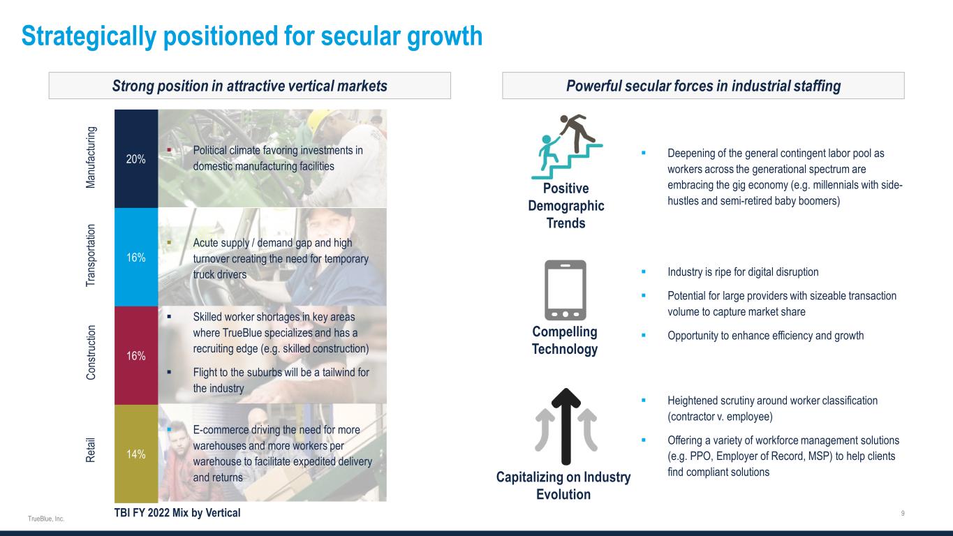 Strategically positioned for secular growth Strong position in attractive vertical markets Powerful secular forces in industrial staffing  Deepening of the general contingent labor pool as workers across the generational spectrum are embracing the gig economy (e.g. millennials with side- hustles and semi-retired baby boomers) Positive Demographic Trends  Industry is ripe for digital disruption  Potential for large providers with sizeable transaction volume to capture market share  Opportunity to enhance efficiency and growthCompelling Technology  Heightened scrutiny around worker classification (contractor v. employee)  Offering a variety of workforce management solutions (e.g. PPO, Employer of Record, MSP) to help clients find compliant solutionsCapitalizing on Industry Evolution 14% 16% 16% 20% Co ns tru cti on  Skilled worker shortages in key areas where TrueBlue specializes and has a recruiting edge (e.g. skilled construction)  Flight to the suburbs will be a tailwind for the industry Ma nu fac tur ing  Political climate favoring investments in domestic manufacturing facilities Tr an sp or tat ion  Acute supply / demand gap and high turnover creating the need for temporary truck drivers  E-commerce driving the need for more warehouses and more workers per warehouse to facilitate expedited delivery and returns Re tai l TBI FY 2022 Mix by Vertical