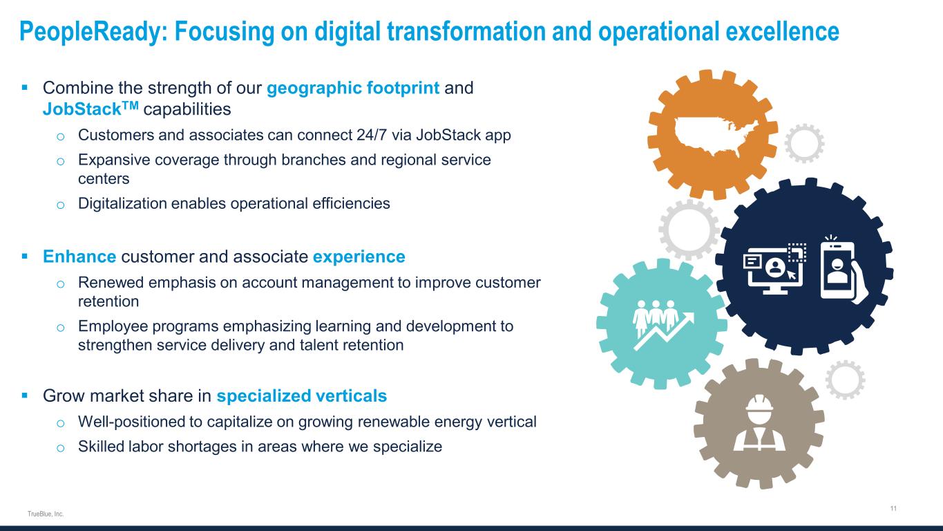  Combine the strength of our geographic footprint and JobStackTM capabilities o Customers and associates can connect 24/7 via JobStack app o Expansive coverage through branches and regional service centers o Digitalization enables operational efficiencies  Enhance customer and associate experience o Renewed emphasis on account management to improve customer retention o Employee programs emphasizing learning and development to strengthen service delivery and talent retention  Grow market share in specialized verticals o Well-positioned to capitalize on growing renewable energy vertical o Skilled labor shortages in areas where we specialize PeopleReady: Focusing on digital transformation and operational excellence