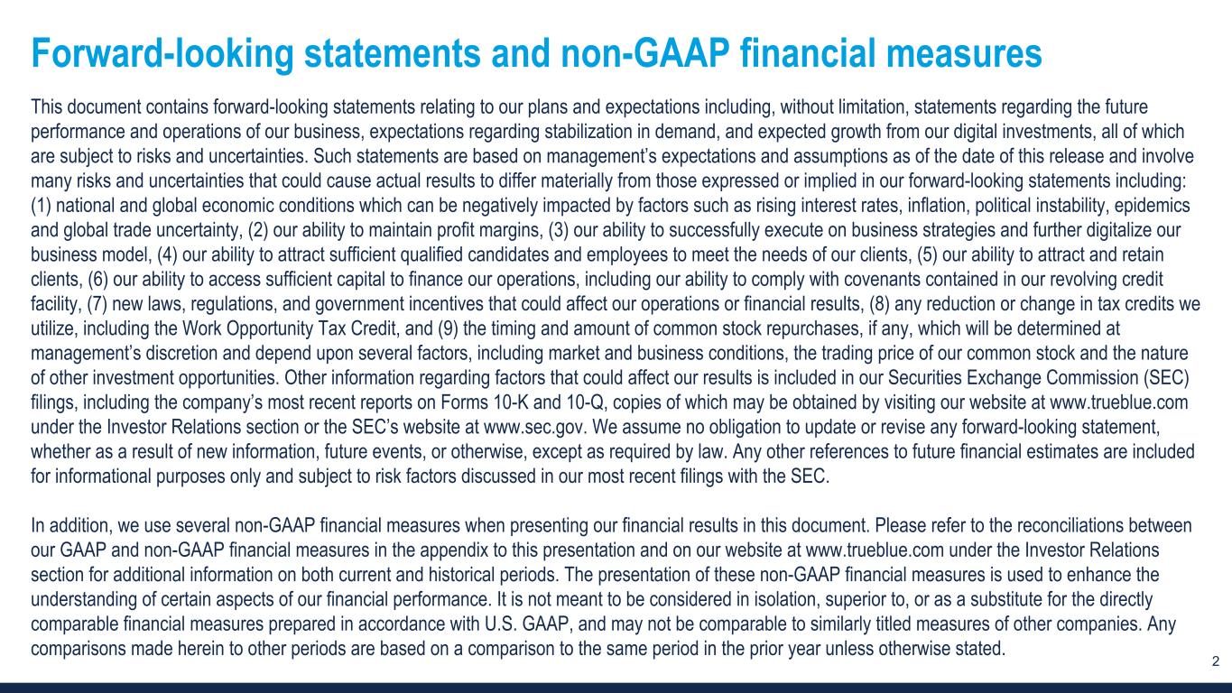 2 Forward-looking statements and non-GAAP financial measures This document contains forward-looking statements relating to our plans and expectations including, without limitation, statements regarding the future performance and operations of our business, expectations regarding stabilization in demand, and expected growth from our digital investments, all of which are subject to risks and uncertainties. Such statements are based on management’s expectations and assumptions as of the date of this release and involve many risks and uncertainties that could cause actual results to differ materially from those expressed or implied in our forward-looking statements including: (1) national and global economic conditions which can be negatively impacted by factors such as rising interest rates, inflation, political instability, epidemics and global trade uncertainty, (2) our ability to maintain profit margins, (3) our ability to successfully execute on business strategies and further digitalize our business model, (4) our ability to attract sufficient qualified candidates and employees to meet the needs of our clients, (5) our ability to attract and retain clients, (6) our ability to access sufficient capital to finance our operations, including our ability to comply with covenants contained in our revolving credit facility, (7) new laws, regulations, and government incentives that could affect our operations or financial results, (8) any reduction or change in tax credits we utilize, including the Work Opportunity Tax Credit, and (9) the timing and amount of common stock repurchases, if any, which will be determined at management’s discretion and depend upon several factors, including market and business conditions, the trading price of our common stock and the nature of other investment opportunities. Other information regarding factors that could affect our results is included in our Securities Exchange Commission (SEC) filings, including the company’s most recent reports on Forms 10-K and 10-Q, copies of which may be obtained by visiting our website at www.trueblue.com under the Investor Relations section or the SEC’s website at www.sec.gov. We assume no obligation to update or revise any forward-looking statement, whether as a result of new information, future events, or otherwise, except as required by law. Any other references to future financial estimates are included for informational purposes only and subject to risk factors discussed in our most recent filings with the SEC. In addition, we use several non-GAAP financial measures when presenting our financial results in this document. Please refer to the reconciliations between our GAAP and non-GAAP financial measures in the appendix to this presentation and on our website at www.trueblue.com under the Investor Relations section for additional information on both current and historical periods. The presentation of these non-GAAP financial measures is used to enhance the understanding of certain aspects of our financial performance. It is not meant to be considered in isolation, superior to, or as a substitute for the directly comparable financial measures prepared in accordance with U.S. GAAP, and may not be comparable to similarly titled measures of other companies. Any comparisons made herein to other periods are based on a comparison to the same period in the prior year unless otherwise stated.
