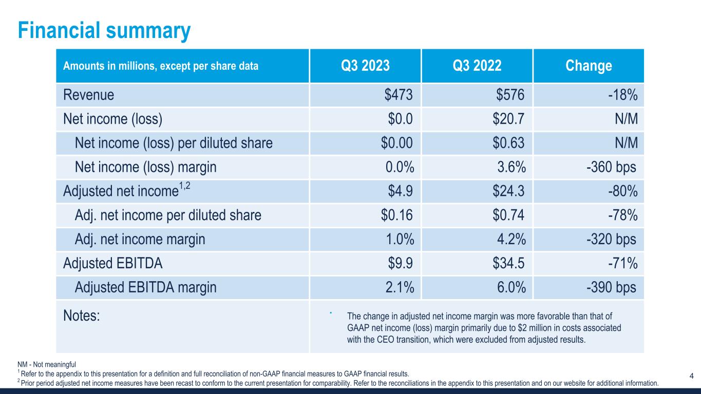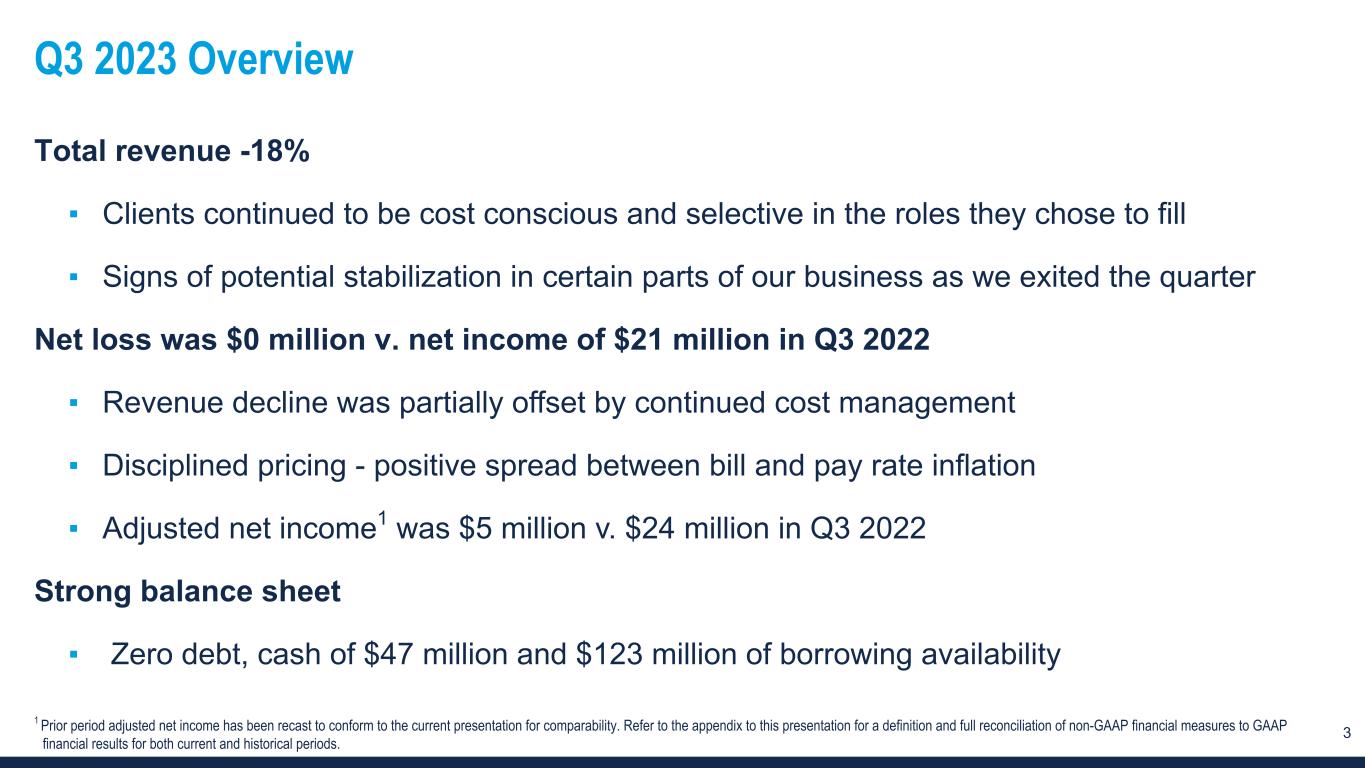 3 Q3 2023 Overview Total revenue -18% ▪ Clients continued to be cost conscious and selective in the roles they chose to fill ▪ Signs of potential stabilization in certain parts of our business as we exited the quarter Net loss was $0 million v. net income of $21 million in Q3 2022 ▪ Revenue decline was partially offset by continued cost management ▪ Disciplined pricing - positive spread between bill and pay rate inflation ▪ Adjusted net income1 was $5 million v. $24 million in Q3 2022 Strong balance sheet ▪ Zero debt, cash of $47 million and $123 million of borrowing availability 1 Prior period adjusted net income has been recast to conform to the current presentation for comparability. Refer to the appendix to this presentation for a definition and full reconciliation of non-GAAP financial measures to GAAP financial results for both current and historical periods.