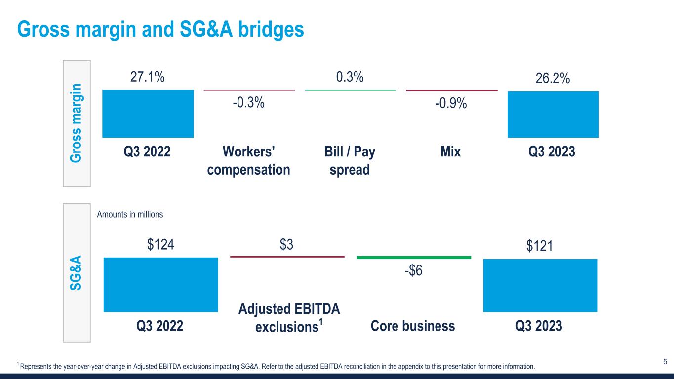 4 Financial summary Amounts in millions, except per share data Q3 2023 Q3 2022 Change Revenue $473 $576 -18 % Net income (loss) $0.0 $20.7 N/M Net income (loss) per diluted share $0.00 $0.63 N/M Net income (loss) margin 0.0 % 3.6 % -360 bps Adjusted net income1,2 $4.9 $24.3 -80 % Adj. net income per diluted share $0.16 $0.74 -78 % Adj. net income margin 1.0 % 4.2 % -320 bps Adjusted EBITDA $9.9 $34.5 -71 % Adjusted EBITDA margin 2.1 % 6.0 % -390 bps Notes: ▪ The change in adjusted net income margin was more favorable than that of GAAP net income (loss) margin primarily due to $2 million in costs associated with the CEO transition, which were excluded from adjusted results. NM - Not meaningful 1 Refer to the appendix to this presentation for a definition and full reconciliation of non-GAAP financial measures to GAAP financial results. 2 Prior period adjusted net income measures have been recast to conform to the current presentation for comparability. Refer to the reconciliations in the appendix to this presentation and on our website for additional information.