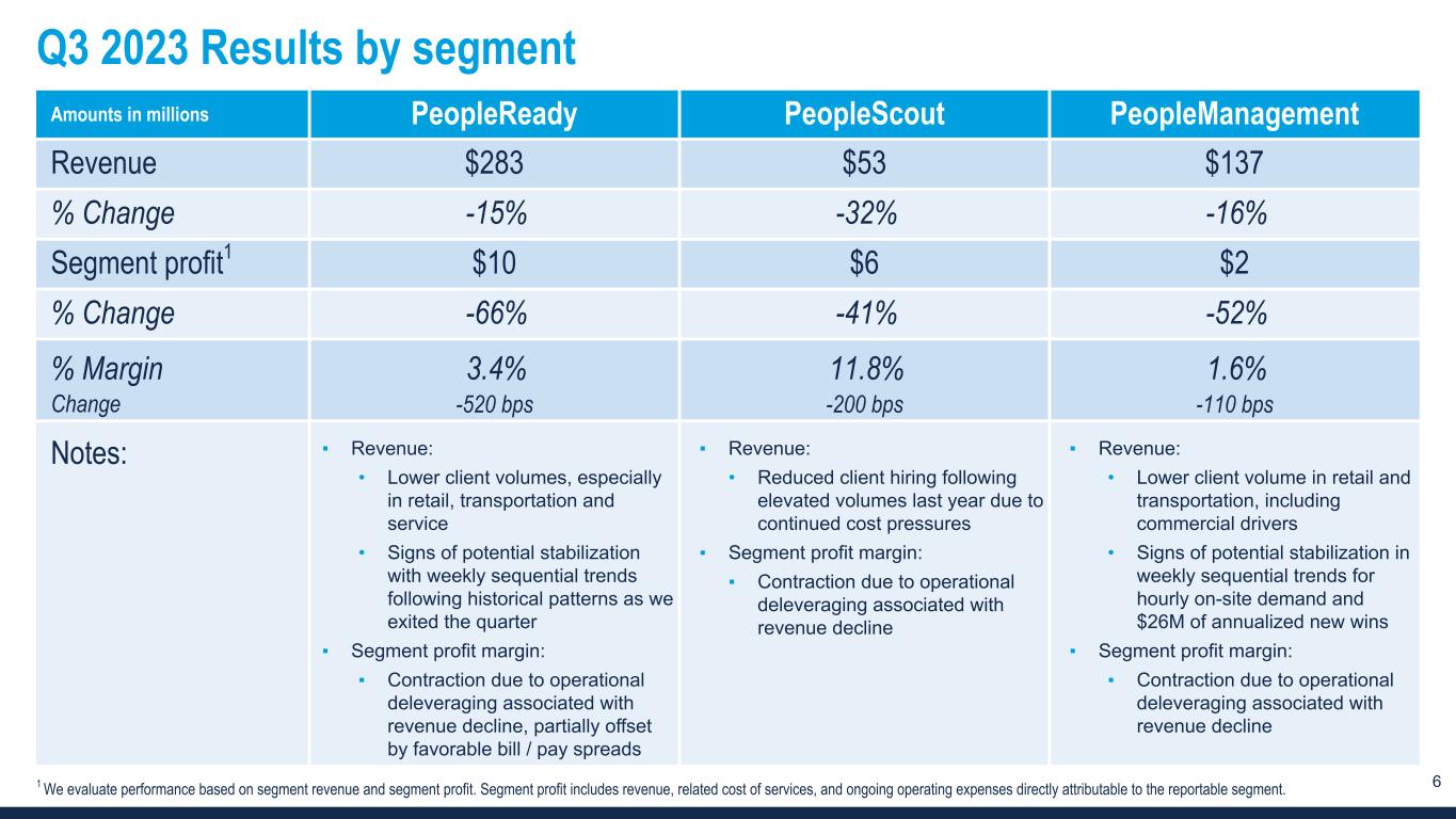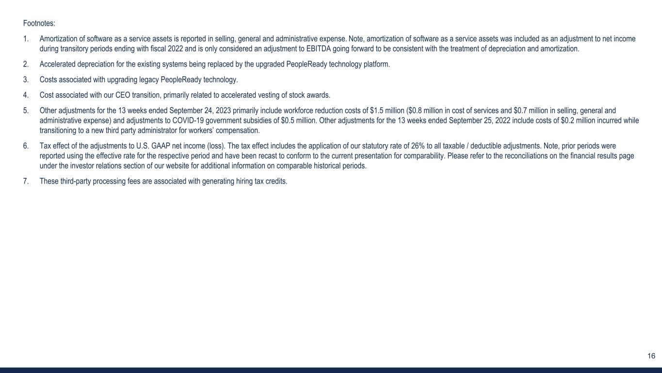 16 Footnotes: 1. Amortization of software as a service assets is reported in selling, general and administrative expense. Note, amortization of software as a service assets was included as an adjustment to net income during transitory periods ending with fiscal 2022 and is only considered an adjustment to EBITDA going forward to be consistent with the treatment of depreciation and amortization. 2. Accelerated depreciation for the existing systems being replaced by the upgraded PeopleReady technology platform. 3. Costs associated with upgrading legacy PeopleReady technology. 4. Cost associated with our CEO transition, primarily related to accelerated vesting of stock awards. 5. Other adjustments for the 13 weeks ended September 24, 2023 primarily include workforce reduction costs of $1.5 million ($0.8 million in cost of services and $0.7 million in selling, general and administrative expense) and adjustments to COVID-19 government subsidies of $0.5 million. Other adjustments for the 13 weeks ended September 25, 2022 include costs of $0.2 million incurred while transitioning to a new third party administrator for workers’ compensation. 6. Tax effect of the adjustments to U.S. GAAP net income (loss). The tax effect includes the application of our statutory rate of 26% to all taxable / deductible adjustments. Note, prior periods were reported using the effective rate for the respective period and have been recast to conform to the current presentation for comparability. Please refer to the reconciliations on the financial results page under the investor relations section of our website for additional information on comparable historical periods. 7. These third-party processing fees are associated with generating hiring tax credits.
