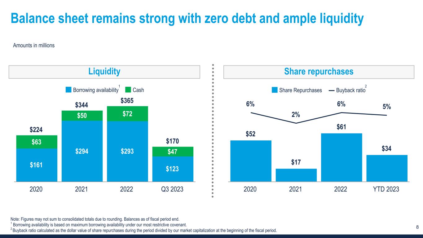 8 Balance sheet remains strong with zero debt and ample liquidity $224 $344 $365 $170 $161 $294 $293 $123 $63 $50 $72 $47 Borrowing availability Cash 2020 2021 2022 Q3 2023 Amounts in millions Note: Figures may not sum to consolidated totals due to rounding. Balances as of fiscal period end. 1 Borrowing availability is based on maximum borrowing availability under our most restrictive covenant. 2 Buyback ratio calculated as the dollar value of share repurchases during the period divided by our market capitalization at the beginning of the fiscal period. Liquidity Share repurchases 1 $52 $17 $61 $34 6% 2% 6% 5% Share Repurchases Buyback ratio 2020 2021 2022 YTD 2023 2