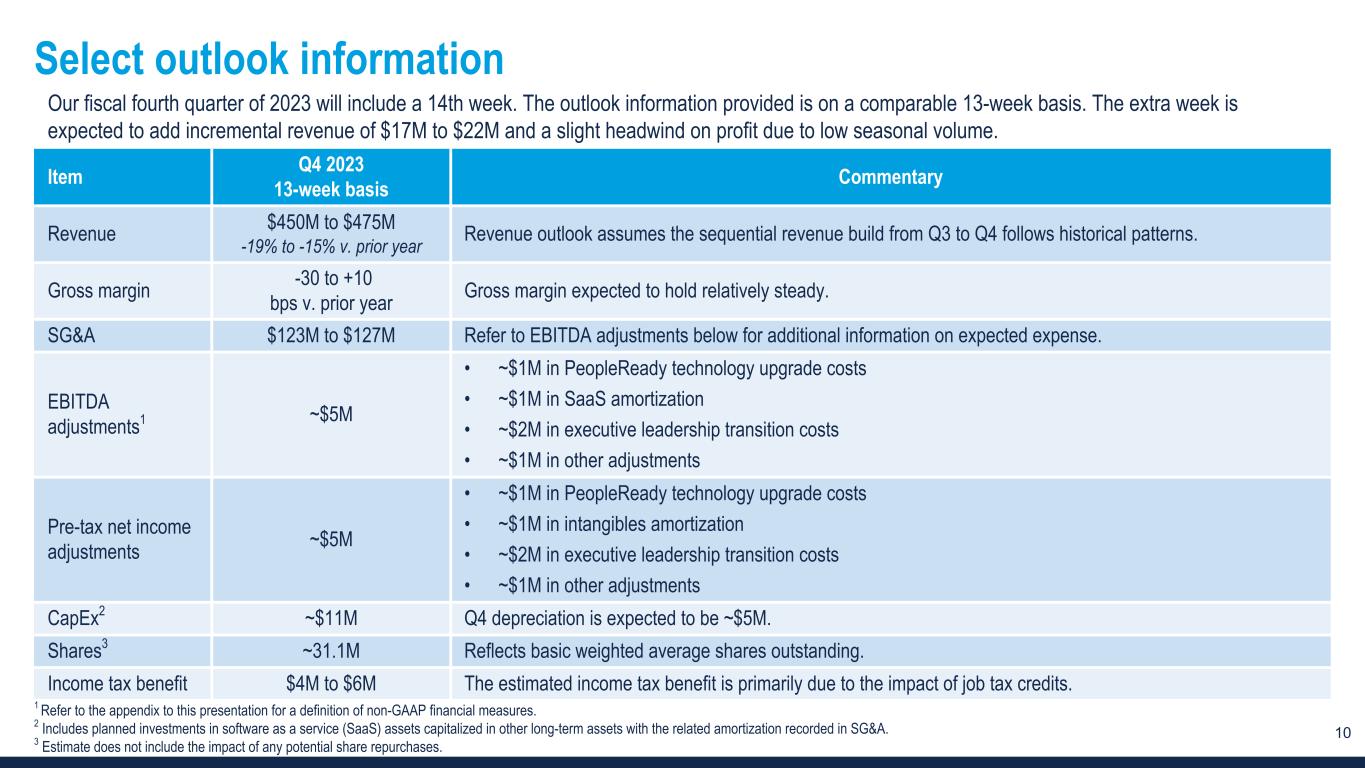10 Select outlook information Item Q4 2023 13-week basis Commentary Revenue $450M to $475M -19% to -15% v. prior year Revenue outlook assumes the sequential revenue build from Q3 to Q4 follows historical patterns. Gross margin -30 to +10 bps v. prior year Gross margin expected to hold relatively steady. SG&A $123M to $127M Refer to EBITDA adjustments below for additional information on expected expense. EBITDA adjustments1 ~$5M • ~$1M in PeopleReady technology upgrade costs • ~$1M in SaaS amortization • ~$2M in executive leadership transition costs • ~$1M in other adjustments Pre-tax net income adjustments ~$5M • ~$1M in PeopleReady technology upgrade costs • ~$1M in intangibles amortization • ~$2M in executive leadership transition costs • ~$1M in other adjustments CapEx2 ~$11M Q4 depreciation is expected to be ~$5M. Shares3 ~31.1M Reflects basic weighted average shares outstanding. Income tax benefit $4M to $6M The estimated income tax benefit is primarily due to the impact of job tax credits. 1 Refer to the appendix to this presentation for a definition of non-GAAP financial measures. 2 Includes planned investments in software as a service (SaaS) assets capitalized in other long-term assets with the related amortization recorded in SG&A. 3 Estimate does not include the impact of any potential share repurchases. Our fiscal fourth quarter of 2023 will include a 14th week. The outlook information provided is on a comparable 13-week basis. The extra week is expected to add incremental revenue of $17M to $22M and a slight headwind on profit due to low seasonal volume.