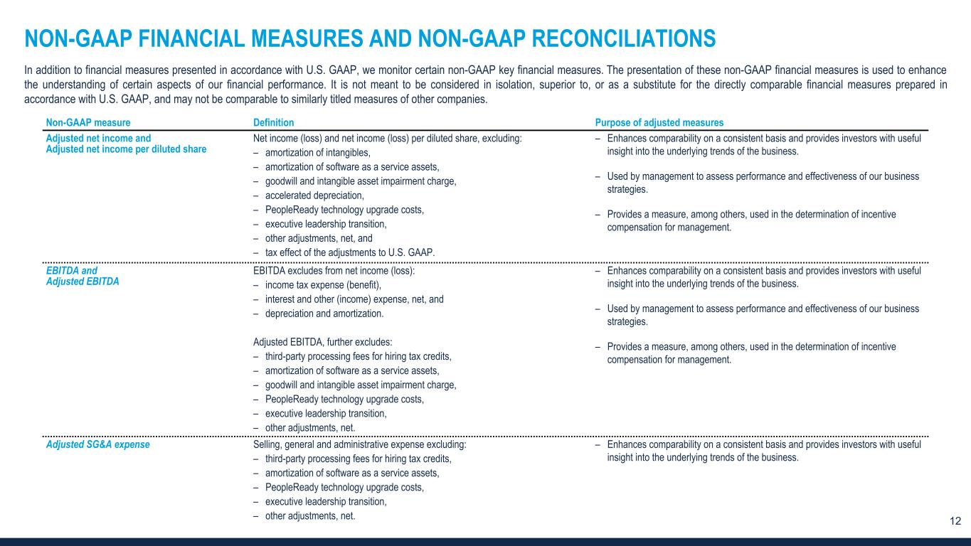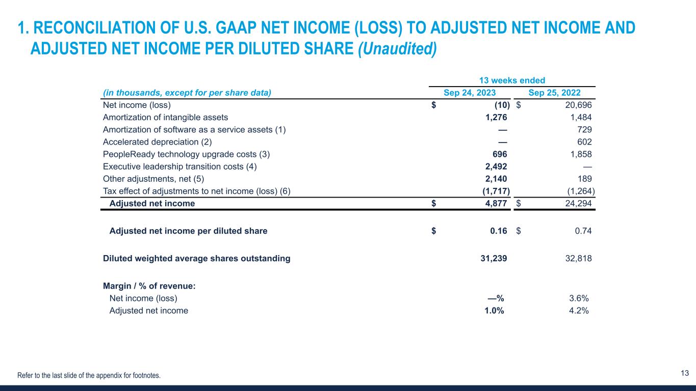 12 NON-GAAP FINANCIAL MEASURES AND NON-GAAP RECONCILIATIONS In addition to financial measures presented in accordance with U.S. GAAP, we monitor certain non-GAAP key financial measures. The presentation of these non-GAAP financial measures is used to enhance the understanding of certain aspects of our financial performance. It is not meant to be considered in isolation, superior to, or as a substitute for the directly comparable financial measures prepared in accordance with U.S. GAAP, and may not be comparable to similarly titled measures of other companies. Non-GAAP measure Definition Purpose of adjusted measures Adjusted net income and Adjusted net income per diluted share Net income (loss) and net income (loss) per diluted share, excluding: – amortization of intangibles, – amortization of software as a service assets, – goodwill and intangible asset impairment charge, – accelerated depreciation, – PeopleReady technology upgrade costs, – executive leadership transition, – other adjustments, net, and – tax effect of the adjustments to U.S. GAAP. – Enhances comparability on a consistent basis and provides investors with useful insight into the underlying trends of the business. – Used by management to assess performance and effectiveness of our business strategies. – Provides a measure, among others, used in the determination of incentive compensation for management. EBITDA and Adjusted EBITDA EBITDA excludes from net income (loss): – income tax expense (benefit), – interest and other (income) expense, net, and – depreciation and amortization. Adjusted EBITDA, further excludes: – third-party processing fees for hiring tax credits, – amortization of software as a service assets, – goodwill and intangible asset impairment charge, – PeopleReady technology upgrade costs, – executive leadership transition, – other adjustments, net. – Enhances comparability on a consistent basis and provides investors with useful insight into the underlying trends of the business. – Used by management to assess performance and effectiveness of our business strategies. – Provides a measure, among others, used in the determination of incentive compensation for management. Adjusted SG&A expense Selling, general and administrative expense excluding: – third-party processing fees for hiring tax credits, – amortization of software as a service assets, – PeopleReady technology upgrade costs, – executive leadership transition, – other adjustments, net. – Enhances comparability on a consistent basis and provides investors with useful insight into the underlying trends of the business.