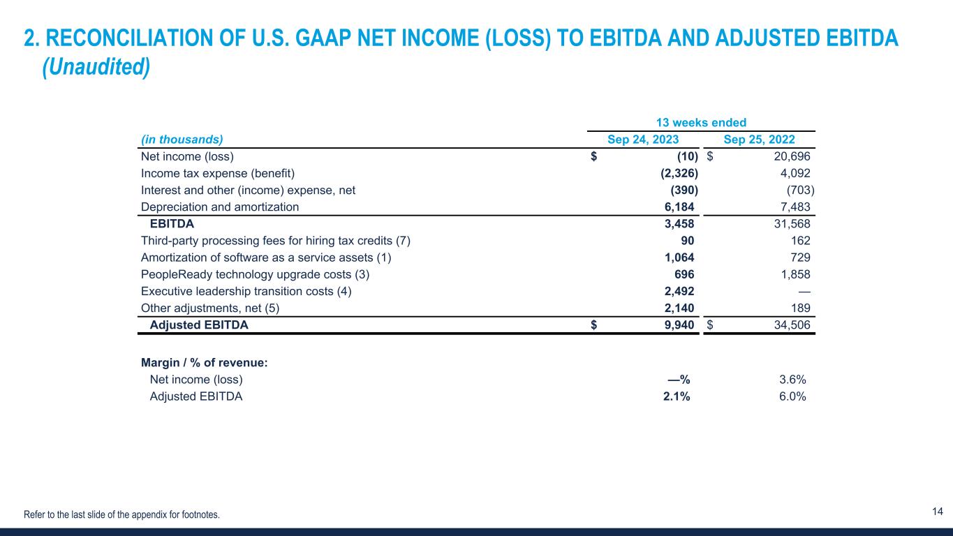 13 1. RECONCILIATION OF U.S. GAAP NET INCOME (LOSS) TO ADJUSTED NET INCOME AND ADJUSTED NET INCOME PER DILUTED SHARE (Unaudited) 13 weeks ended (in thousands, except for per share data) Sep 24, 2023 Sep 25, 2022 Net income (loss) $ (10) $ 20,696 Amortization of intangible assets 1,276 1,484 Amortization of software as a service assets (1) — 729 Accelerated depreciation (2) — 602 PeopleReady technology upgrade costs (3) 696 1,858 Executive leadership transition costs (4) 2,492 — Other adjustments, net (5) 2,140 189 Tax effect of adjustments to net income (loss) (6) (1,717) (1,264) Adjusted net income $ 4,877 $ 24,294 Adjusted net income per diluted share $ 0.16 $ 0.74 Diluted weighted average shares outstanding 31,239 32,818 Margin / % of revenue: Net income (loss) — % 3.6 % Adjusted net income 1.0 % 4.2 % Refer to the last slide of the appendix for footnotes.