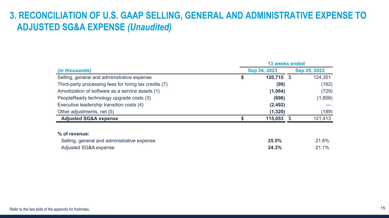 14 2. RECONCILIATION OF U.S. GAAP NET INCOME (LOSS) TO EBITDA AND ADJUSTED EBITDA (Unaudited) 13 weeks ended (in thousands) Sep 24, 2023 Sep 25, 2022 Net income (loss) $ (10) $ 20,696 Income tax expense (benefit) (2,326) 4,092 Interest and other (income) expense, net (390) (703) Depreciation and amortization 6,184 7,483 EBITDA 3,458 31,568 Third-party processing fees for hiring tax credits (7) 90 162 Amortization of software as a service assets (1) 1,064 729 PeopleReady technology upgrade costs (3) 696 1,858 Executive leadership transition costs (4) 2,492 — Other adjustments, net (5) 2,140 189 Adjusted EBITDA $ 9,940 $ 34,506 Margin / % of revenue: Net income (loss) — % 3.6 % Adjusted EBITDA 2.1 % 6.0 % Refer to the last slide of the appendix for footnotes.