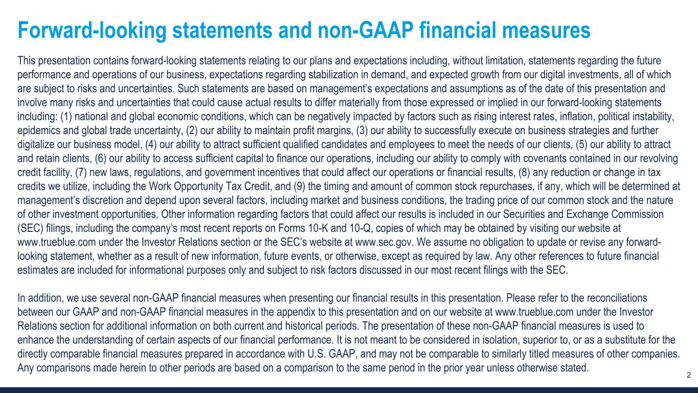 2 Forward-looking statements and non-GAAP financial measures This presentation contains forward-looking statements relating to our plans and expectations including, without limitation, statements regarding the future performance and operations of our business, expectations regarding stabilization in demand, and expected growth from our digital investments, all of which are subject to risks and uncertainties. Such statements are based on management’s expectations and assumptions as of the date of this presentation and involve many risks and uncertainties that could cause actual results to differ materially from those expressed or implied in our forward-looking statements including: (1) national and global economic conditions, which can be negatively impacted by factors such as rising interest rates, inflation, political instability, epidemics and global trade uncertainty, (2) our ability to maintain profit margins, (3) our ability to successfully execute on business strategies and further digitalize our business model, (4) our ability to attract sufficient qualified candidates and employees to meet the needs of our clients, (5) our ability to attract and retain clients, (6) our ability to access sufficient capital to finance our operations, including our ability to comply with covenants contained in our revolving credit facility, (7) new laws, regulations, and government incentives that could affect our operations or financial results, (8) any reduction or change in tax credits we utilize, including the Work Opportunity Tax Credit, and (9) the timing and amount of common stock repurchases, if any, which will be determined at management’s discretion and depend upon several factors, including market and business conditions, the trading price of our common stock and the nature of other investment opportunities. Other information regarding factors that could affect our results is included in our Securities and Exchange Commission (SEC) filings, including the company’s most recent reports on Forms 10-K and 10-Q, copies of which may be obtained by visiting our website at www.trueblue.com under the Investor Relations section or the SEC’s website at www.sec.gov. We assume no obligation to update or revise any forward- looking statement, whether as a result of new information, future events, or otherwise, except as required by law. Any other references to future financial estimates are included for informational purposes only and subject to risk factors discussed in our most recent filings with the SEC. In addition, we use several non-GAAP financial measures when presenting our financial results in this presentation. Please refer to the reconciliations between our GAAP and non-GAAP financial measures in the appendix to this presentation and on our website at www.trueblue.com under the Investor Relations section for additional information on both current and historical periods. The presentation of these non-GAAP financial measures is used to enhance the understanding of certain aspects of our financial performance. It is not meant to be considered in isolation, superior to, or as a substitute for the directly comparable financial measures prepared in accordance with U.S. GAAP, and may not be comparable to similarly titled measures of other companies. Any comparisons made herein to other periods are based on a comparison to the same period in the prior year unless otherwise stated.