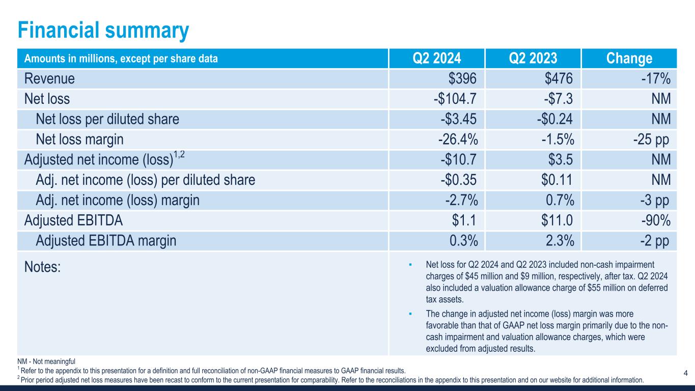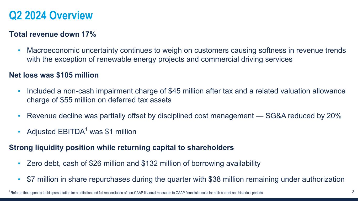 3 Q2 2024 Overview Total revenue down 17% ▪ Macroeconomic uncertainty continues to weigh on customers causing softness in revenue trends with the exception of renewable energy projects and commercial driving services Net loss was $105 million ▪ Included a non-cash impairment charge of $45 million after tax and a related valuation allowance charge of $55 million on deferred tax assets ▪ Revenue decline was partially offset by disciplined cost management — SG&A reduced by 20% ▪ Adjusted EBITDA1 was $1 million Strong liquidity position while returning capital to shareholders ▪ Zero debt, cash of $26 million and $132 million of borrowing availability ▪ $7 million in share repurchases during the quarter with $38 million remaining under authorization 1 Refer to the appendix to this presentation for a definition and full reconciliation of non-GAAP financial measures to GAAP financial results for both current and historical periods.
