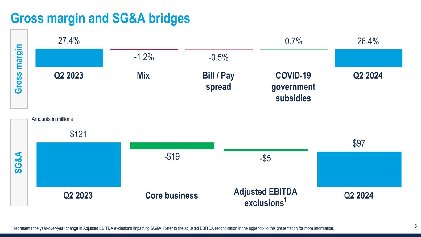 4 Financial summary Amounts in millions, except per share data Q2 2024 Q2 2023 Change Revenue $396 $476 -17 % Net loss -$104.7 -$7.3 NM Net loss per diluted share -$3.45 -$0.24 NM Net loss margin -26.4 % -1.5 % -25 pp Adjusted net income (loss)1,2 -$10.7 $3.5 NM Adj. net income (loss) per diluted share -$0.35 $0.11 NM Adj. net income (loss) margin -2.7 % 0.7 % -3 pp Adjusted EBITDA $1.1 $11.0 -90 % Adjusted EBITDA margin 0.3 % 2.3 % -2 pp Notes: ▪ Net loss for Q2 2024 and Q2 2023 included non-cash impairment charges of $45 million and $9 million, respectively, after tax. Q2 2024 also included a valuation allowance charge of $55 million on deferred tax assets. ▪ The change in adjusted net income (loss) margin was more favorable than that of GAAP net loss margin primarily due to the non- cash impairment and valuation allowance charges, which were excluded from adjusted results. NM - Not meaningful 1 Refer to the appendix to this presentation for a definition and full reconciliation of non-GAAP financial measures to GAAP financial results. 2 Prior period adjusted net loss measures have been recast to conform to the current presentation for comparability. Refer to the reconciliations in the appendix to this presentation and on our website for additional information.