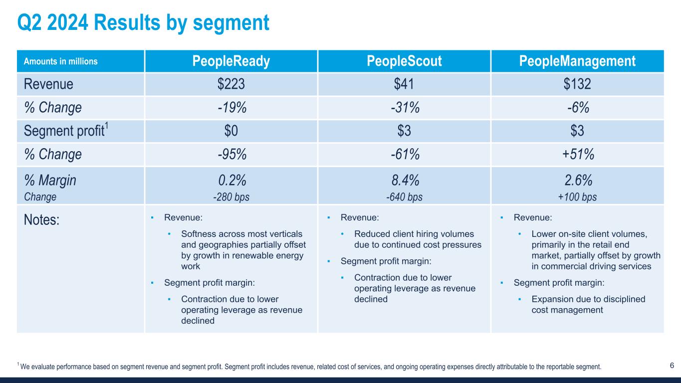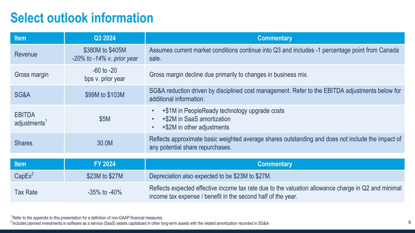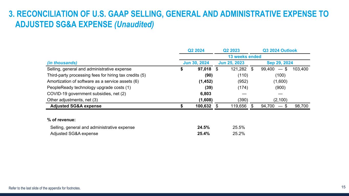 14 2. RECONCILIATION OF U.S. GAAP NET LOSS TO EBITDA AND ADJUSTED EBITDA (Unaudited) Refer to the last slide of the appendix for footnotes. 13 weeks ended (in thousands) Jun 30, 2024 Jun 25, 2023 Net loss $ (104,710) $ (7,323) Income tax expense 46,491 1,345 Interest and other (income) expense, net (1,741) (578) Depreciation and amortization 7,691 6,280 EBITDA (52,269) (276) Third-party processing fees for hiring tax credits (5) 90 110 Amortization of software as a service assets (6) 1,452 952 Goodwill and intangible asset impairment charge 59,674 9,485 PeopleReady technology upgrade costs (1) 39 174 COVID-19 government subsidies, net (2) (9,696) — Other adjustments, net (3) 1,779 565 Adjusted EBITDA $ 1,069 $ 11,010 Margin / % of revenue: Net loss (26.4) % (1.5) % Adjusted EBITDA 0.3 % 2.3 %