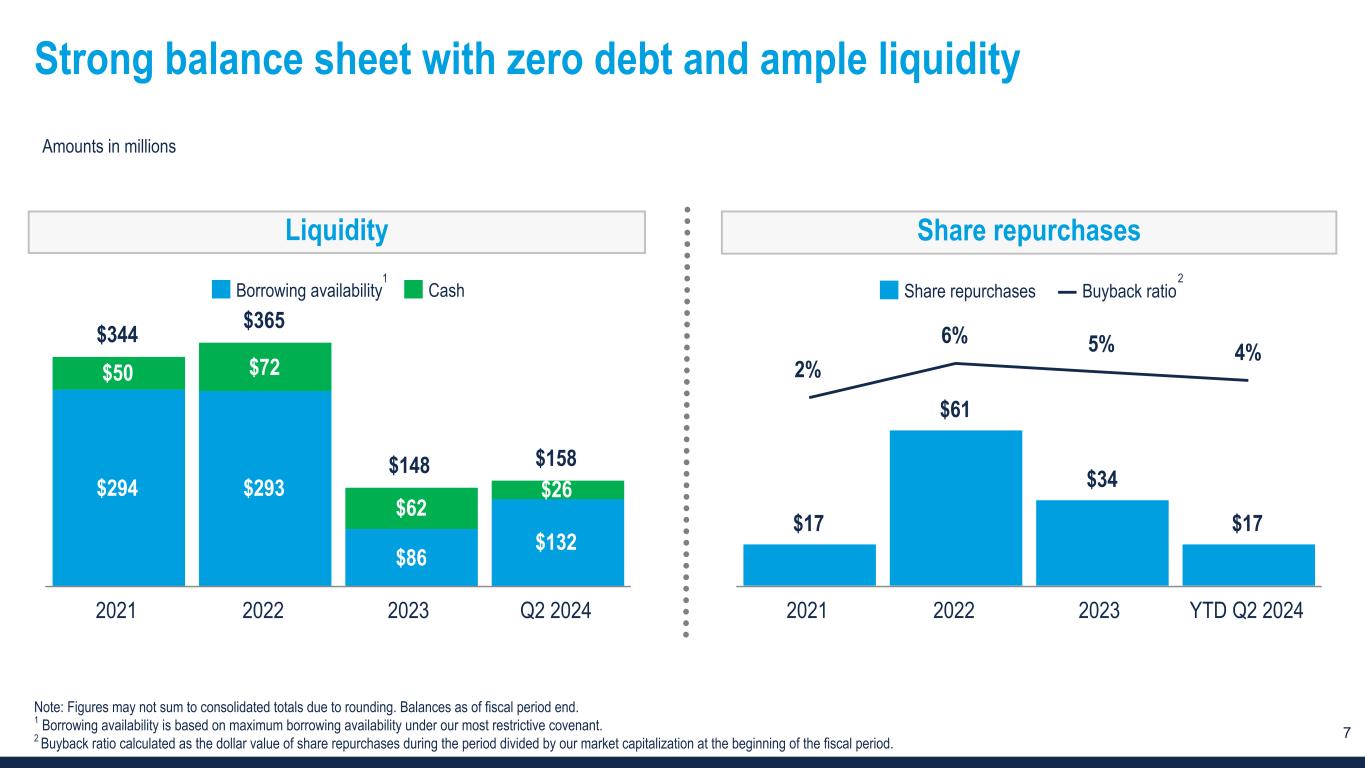 7 Strong balance sheet with zero debt and ample liquidity $344 $365 $148 $158 $294 $293 $86 $132 $50 $72 $62 $26 Borrowing availability Cash 2021 2022 2023 Q2 2024 Amounts in millions Note: Figures may not sum to consolidated totals due to rounding. Balances as of fiscal period end. 1 Borrowing availability is based on maximum borrowing availability under our most restrictive covenant. 2 Buyback ratio calculated as the dollar value of share repurchases during the period divided by our market capitalization at the beginning of the fiscal period. Liquidity Share repurchases 1 $17 $61 $34 $17 2% 6% 5% 4% Share repurchases Buyback ratio 2021 2022 2023 YTD Q2 2024 2