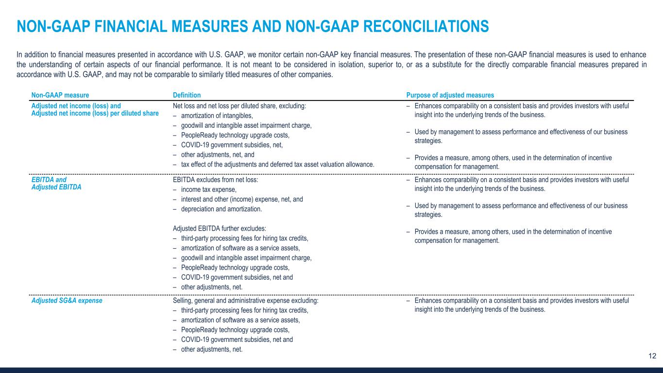 12 NON-GAAP FINANCIAL MEASURES AND NON-GAAP RECONCILIATIONS In addition to financial measures presented in accordance with U.S. GAAP, we monitor certain non-GAAP key financial measures. The presentation of these non-GAAP financial measures is used to enhance the understanding of certain aspects of our financial performance. It is not meant to be considered in isolation, superior to, or as a substitute for the directly comparable financial measures prepared in accordance with U.S. GAAP, and may not be comparable to similarly titled measures of other companies. Non-GAAP measure Definition Purpose of adjusted measures Adjusted net income (loss) and Adjusted net income (loss) per diluted share Net loss and net loss per diluted share, excluding: – amortization of intangibles, – goodwill and intangible asset impairment charge, – PeopleReady technology upgrade costs, – COVID-19 government subsidies, net, – other adjustments, net, and – tax effect of the adjustments and deferred tax asset valuation allowance. – Enhances comparability on a consistent basis and provides investors with useful insight into the underlying trends of the business. – Used by management to assess performance and effectiveness of our business strategies. – Provides a measure, among others, used in the determination of incentive compensation for management. EBITDA and Adjusted EBITDA EBITDA excludes from net loss: – income tax expense, – interest and other (income) expense, net, and – depreciation and amortization. Adjusted EBITDA further excludes: – third-party processing fees for hiring tax credits, – amortization of software as a service assets, – goodwill and intangible asset impairment charge, – PeopleReady technology upgrade costs, – COVID-19 government subsidies, net and – other adjustments, net. – Enhances comparability on a consistent basis and provides investors with useful insight into the underlying trends of the business. – Used by management to assess performance and effectiveness of our business strategies. – Provides a measure, among others, used in the determination of incentive compensation for management. Adjusted SG&A expense Selling, general and administrative expense excluding: – third-party processing fees for hiring tax credits, – amortization of software as a service assets, – PeopleReady technology upgrade costs, – COVID-19 government subsidies, net and – other adjustments, net. – Enhances comparability on a consistent basis and provides investors with useful insight into the underlying trends of the business.