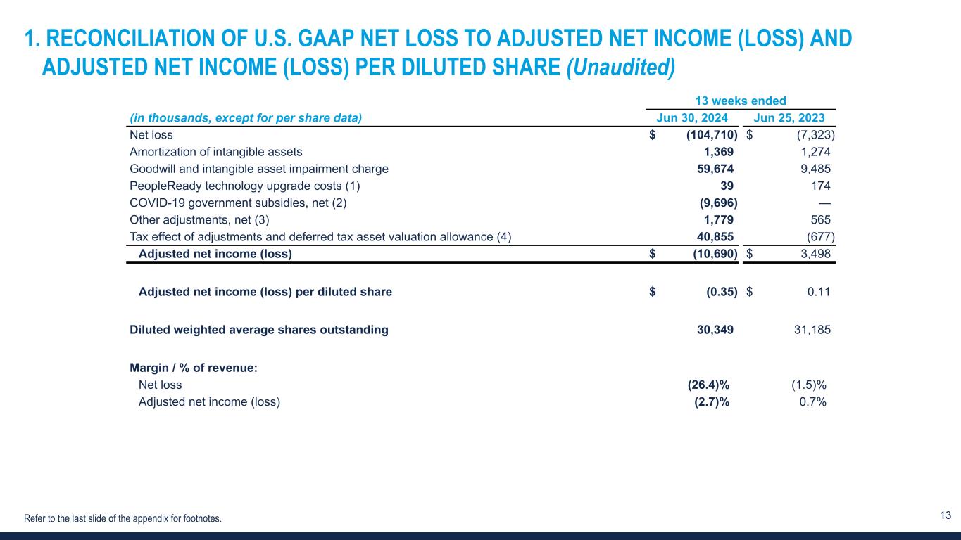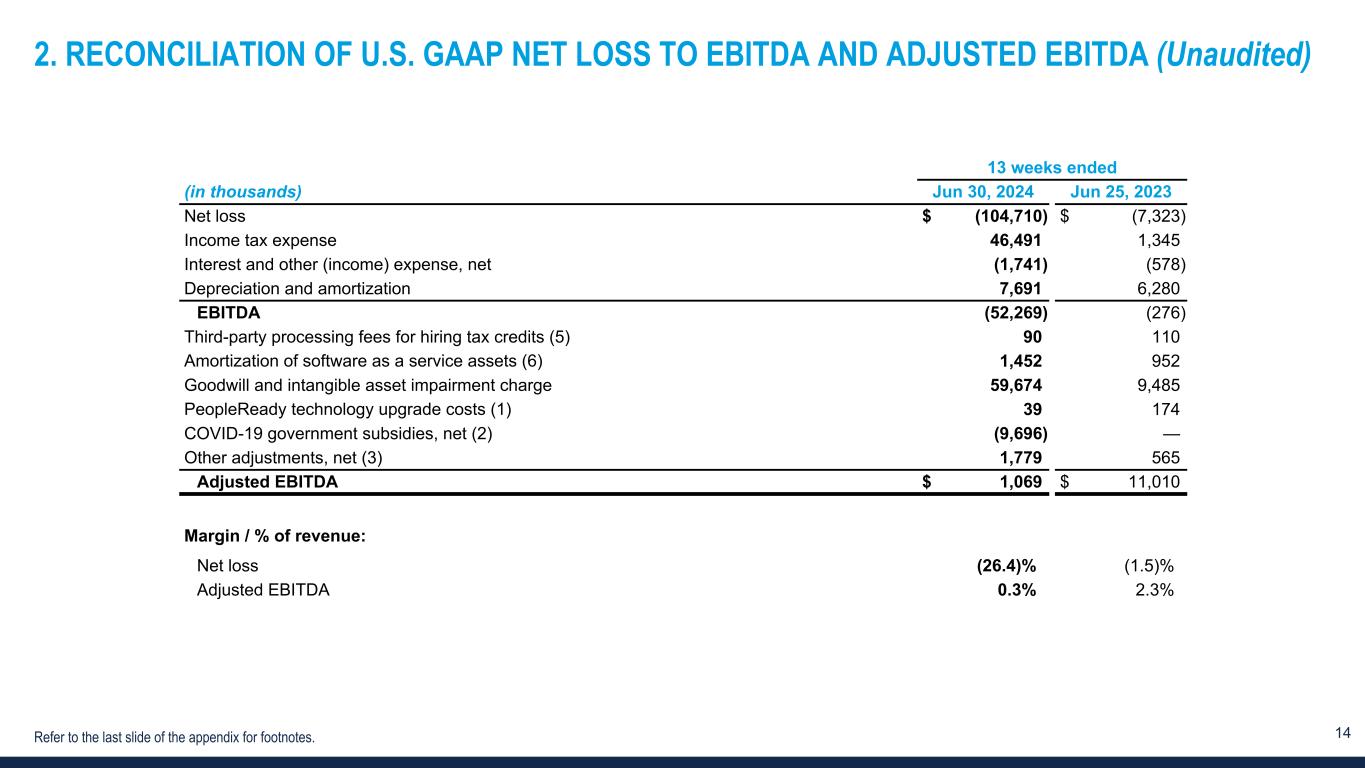 13 1. RECONCILIATION OF U.S. GAAP NET LOSS TO ADJUSTED NET INCOME (LOSS) AND ADJUSTED NET INCOME (LOSS) PER DILUTED SHARE (Unaudited) 13 weeks ended (in thousands, except for per share data) Jun 30, 2024 Jun 25, 2023 Net loss $ (104,710) $ (7,323) Amortization of intangible assets 1,369 1,274 Goodwill and intangible asset impairment charge 59,674 9,485 PeopleReady technology upgrade costs (1) 39 174 COVID-19 government subsidies, net (2) (9,696) — Other adjustments, net (3) 1,779 565 Tax effect of adjustments and deferred tax asset valuation allowance (4) 40,855 (677) Adjusted net income (loss) $ (10,690) $ 3,498 Adjusted net income (loss) per diluted share $ (0.35) $ 0.11 Diluted weighted average shares outstanding 30,349 31,185 Margin / % of revenue: Net loss (26.4) % (1.5) % Adjusted net income (loss) (2.7) % 0.7 % Refer to the last slide of the appendix for footnotes.
