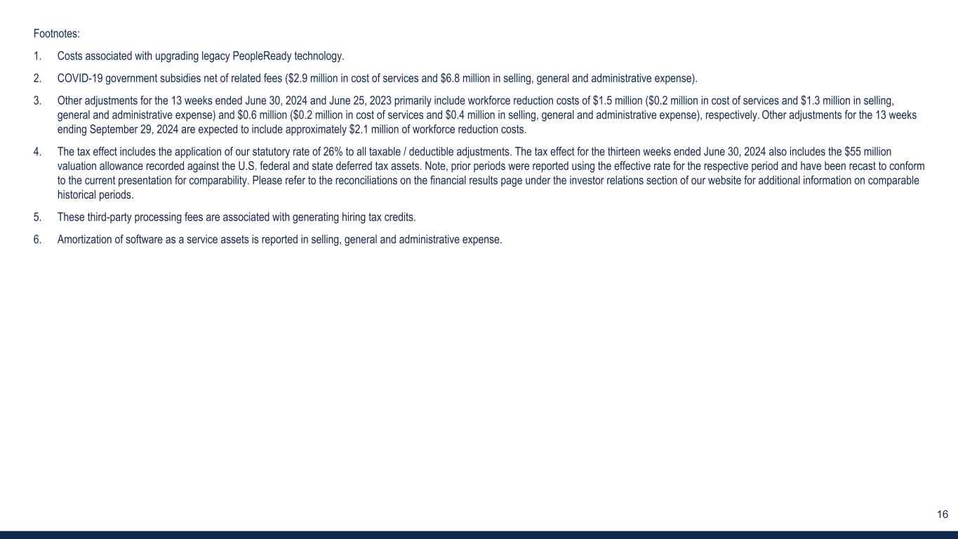 15 3. RECONCILIATION OF U.S. GAAP SELLING, GENERAL AND ADMINISTRATIVE EXPENSE TO ADJUSTED SG&A EXPENSE (Unaudited) Refer to the last slide of the appendix for footnotes. Q2 2024 Q2 2023 Q3 2024 Outlook 13 weeks ended (in thousands) Jun 30, 2024 Jun 25, 2023 Sep 29, 2024 Selling, general and administrative expense $ 97,018 $ 121,282 $ 99,400 — $ 103,400 Third-party processing fees for hiring tax credits (5) (90) (110) (100) Amortization of software as a service assets (6) (1,452) (952) (1,600) PeopleReady technology upgrade costs (1) (39) (174) (900) COVID-19 government subsidies, net (2) 6,803 — — Other adjustments, net (3) (1,608) (390) (2,100) Adjusted SG&A expense $ 100,632 $ 119,656 $ 94,700 — $ 98,700 % of revenue: Selling, general and administrative expense 24.5 % 25.5 % Adjusted SG&A expense 25.4 % 25.2 %