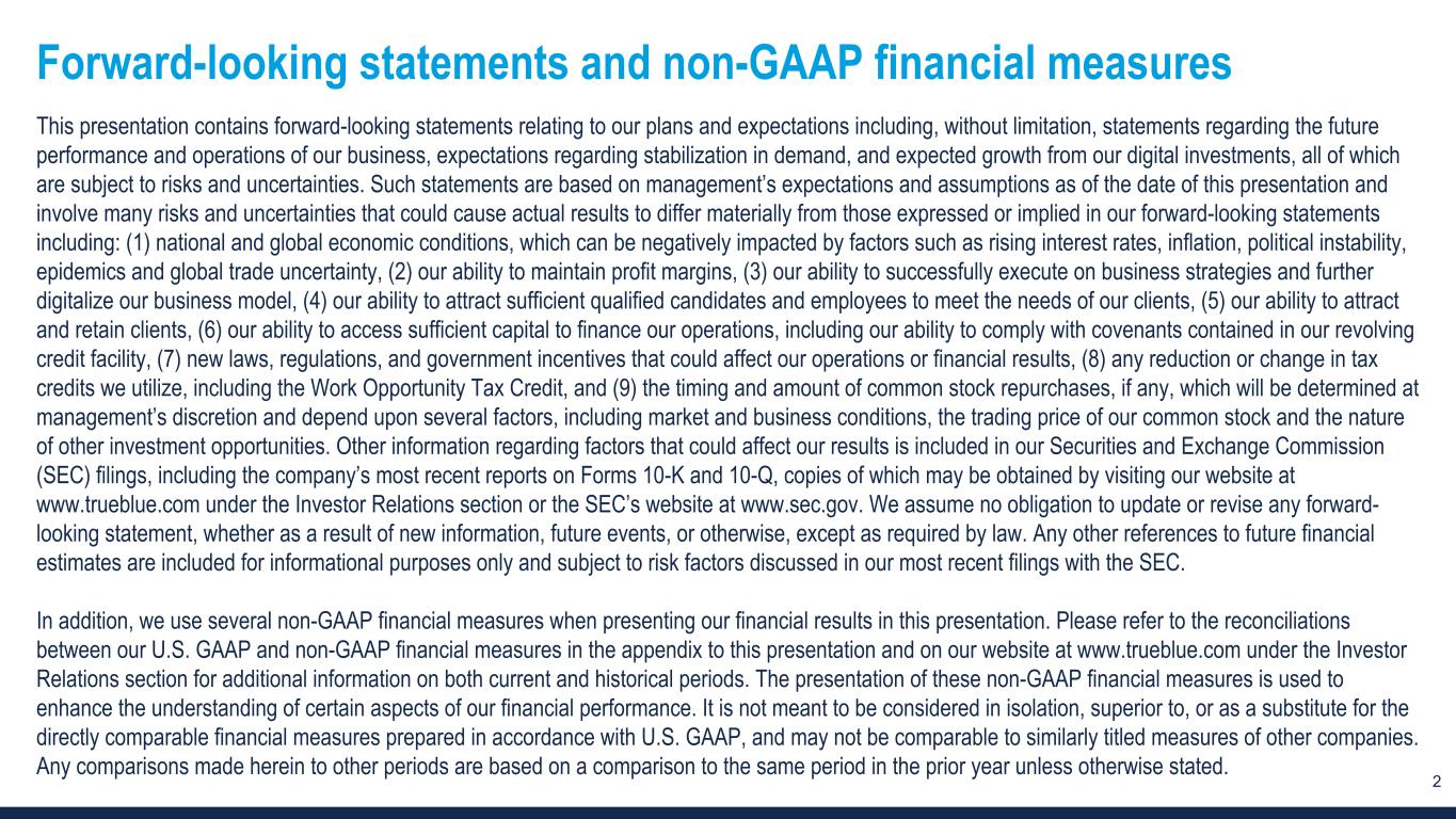 2 Forward-looking statements and non-GAAP financial measures This presentation contains forward-looking statements relating to our plans and expectations including, without limitation, statements regarding the future performance and operations of our business, expectations regarding stabilization in demand, and expected growth from our digital investments, all of which are subject to risks and uncertainties. Such statements are based on management’s expectations and assumptions as of the date of this presentation and involve many risks and uncertainties that could cause actual results to differ materially from those expressed or implied in our forward-looking statements including: (1) national and global economic conditions, which can be negatively impacted by factors such as rising interest rates, inflation, political instability, epidemics and global trade uncertainty, (2) our ability to maintain profit margins, (3) our ability to successfully execute on business strategies and further digitalize our business model, (4) our ability to attract sufficient qualified candidates and employees to meet the needs of our clients, (5) our ability to attract and retain clients, (6) our ability to access sufficient capital to finance our operations, including our ability to comply with covenants contained in our revolving credit facility, (7) new laws, regulations, and government incentives that could affect our operations or financial results, (8) any reduction or change in tax credits we utilize, including the Work Opportunity Tax Credit, and (9) the timing and amount of common stock repurchases, if any, which will be determined at management’s discretion and depend upon several factors, including market and business conditions, the trading price of our common stock and the nature of other investment opportunities. Other information regarding factors that could affect our results is included in our Securities and Exchange Commission (SEC) filings, including the company’s most recent reports on Forms 10-K and 10-Q, copies of which may be obtained by visiting our website at www.trueblue.com under the Investor Relations section or the SEC’s website at www.sec.gov. We assume no obligation to update or revise any forward- looking statement, whether as a result of new information, future events, or otherwise, except as required by law. Any other references to future financial estimates are included for informational purposes only and subject to risk factors discussed in our most recent filings with the SEC. In addition, we use several non-GAAP financial measures when presenting our financial results in this presentation. Please refer to the reconciliations between our U.S. GAAP and non-GAAP financial measures in the appendix to this presentation and on our website at www.trueblue.com under the Investor Relations section for additional information on both current and historical periods. The presentation of these non-GAAP financial measures is used to enhance the understanding of certain aspects of our financial performance. It is not meant to be considered in isolation, superior to, or as a substitute for the directly comparable financial measures prepared in accordance with U.S. GAAP, and may not be comparable to similarly titled measures of other companies. Any comparisons made herein to other periods are based on a comparison to the same period in the prior year unless otherwise stated.