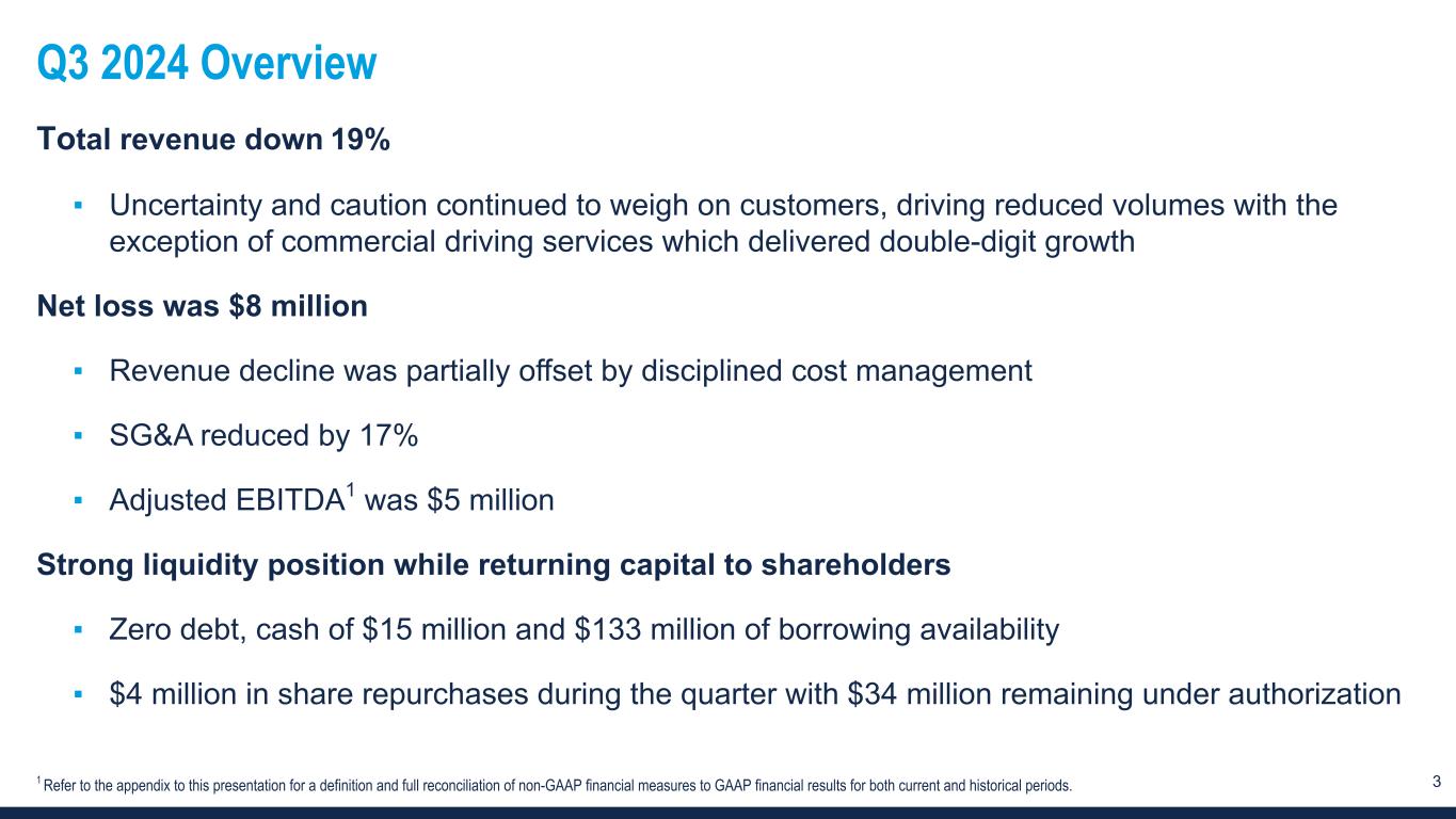 3 Q3 2024 Overview Total revenue down 19% ▪ Uncertainty and caution continued to weigh on customers, driving reduced volumes with the exception of commercial driving services which delivered double-digit growth Net loss was $8 million ▪ Revenue decline was partially offset by disciplined cost management ▪ SG&A reduced by 17% ▪ Adjusted EBITDA1 was $5 million Strong liquidity position while returning capital to shareholders ▪ Zero debt, cash of $15 million and $133 million of borrowing availability ▪ $4 million in share repurchases during the quarter with $34 million remaining under authorization 1 Refer to the appendix to this presentation for a definition and full reconciliation of non-GAAP financial measures to GAAP financial results for both current and historical periods.