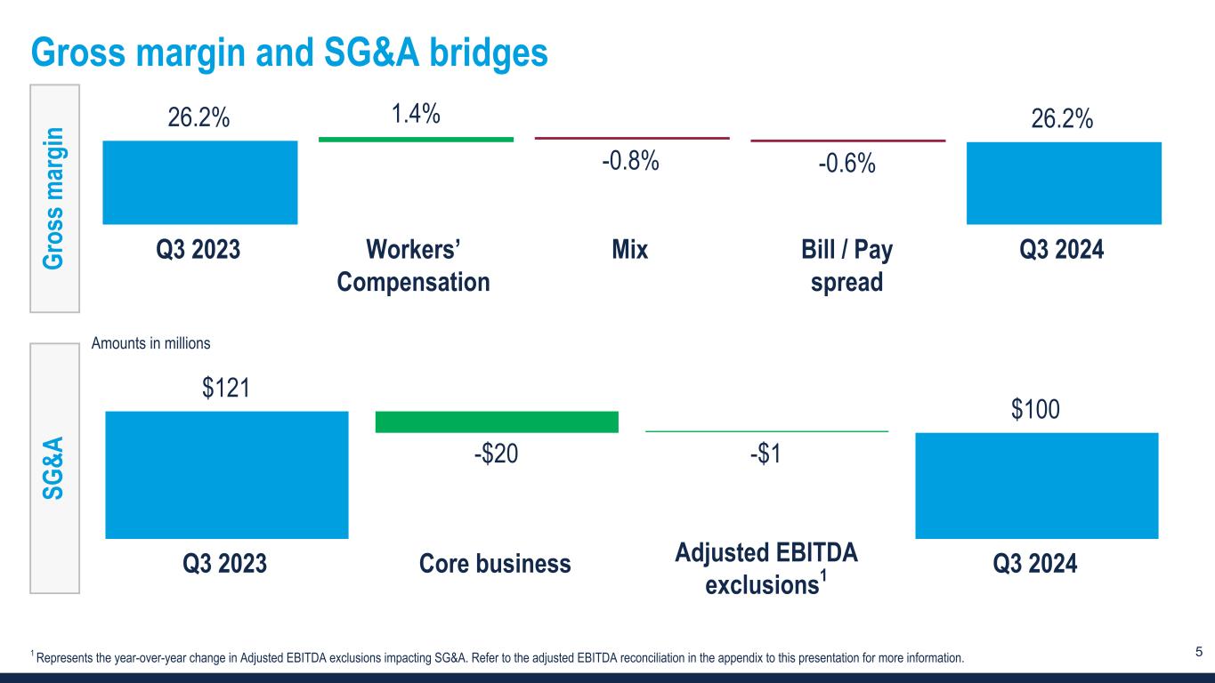 4 Financial summary Amounts in millions, except per share data Q3 2024 Q3 2023 Change Revenue $382 $473 -19 % Net loss -$7.6 $0.0 NM Net loss per diluted share -$0.26 $0.00 NM Net loss margin -2.0 % — % -2 pp Adjusted net income (loss)1 -$3.3 $4.9 NM Adj. net income (loss) per diluted share -$0.11 $0.16 NM Adj. net income (loss) margin -0.9 % 1.0 % -2 pp Adjusted EBITDA $4.7 $9.9 -53 % Adjusted EBITDA margin 1.2 % 2.1 % -1 pp NM - Not meaningful 1 Refer to the appendix to this presentation for a definition and full reconciliation of non-GAAP financial measures to GAAP financial results.