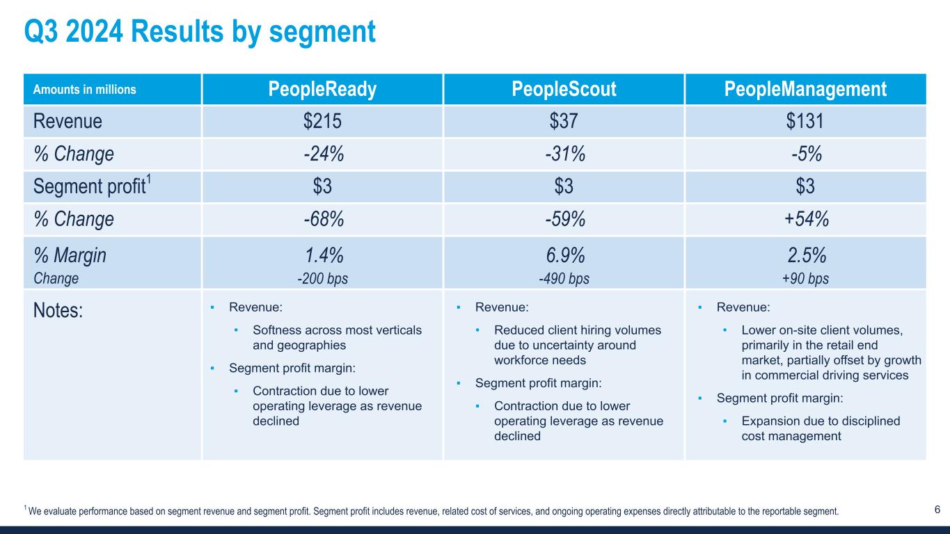 5 Gross margin and SG&A bridges Gr os s m ar gi n 26.2% 1.4% -0.8% -0.6% 26.2% Q3 2023 Workers’ Compensation Mix Bill / Pay spread Q3 2024 SG &A $121 -$20 -$1 $100 Q3 2023 Core business Q3 2024 Amounts in millions 1 Represents the year-over-year change in Adjusted EBITDA exclusions impacting SG&A. Refer to the adjusted EBITDA reconciliation in the appendix to this presentation for more information. Adjusted EBITDA exclusions1