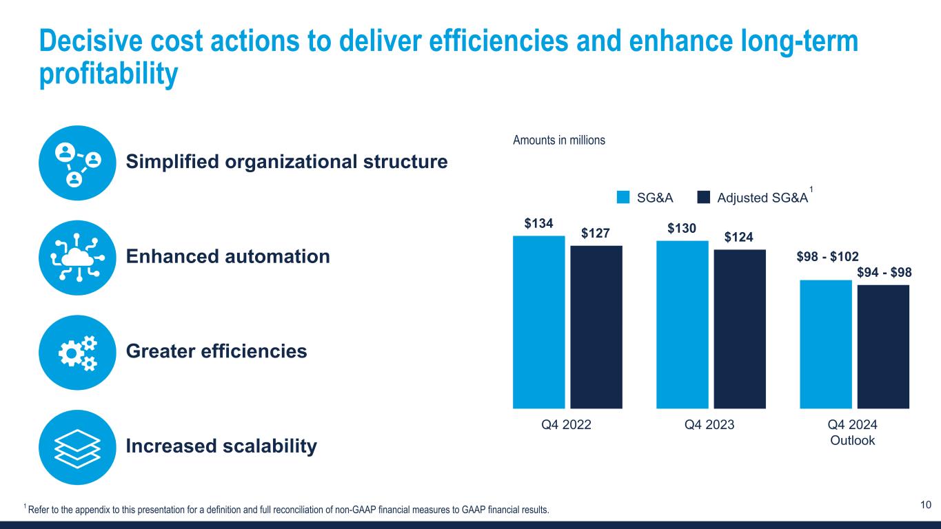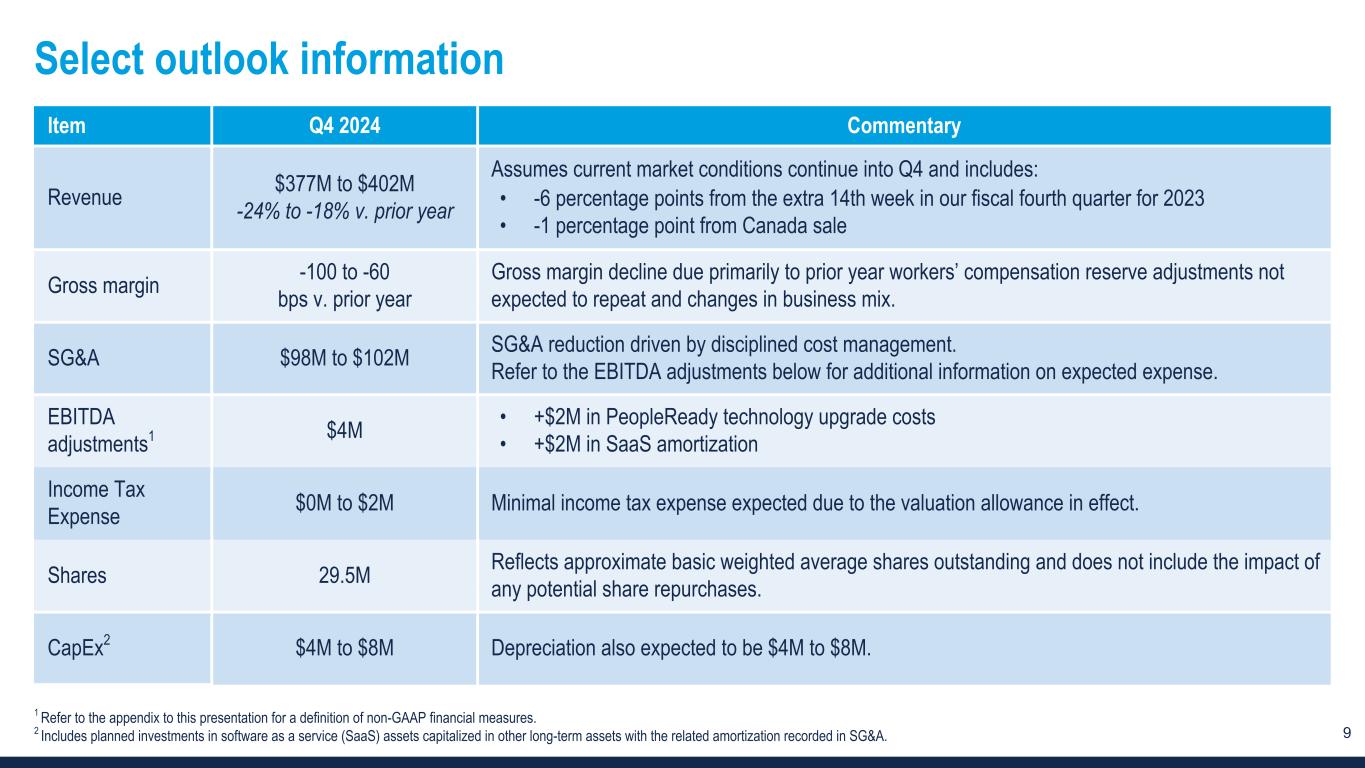 9 Select outlook information Item Q4 2024 Commentary Revenue $377M to $402M -24% to -18% v. prior year Assumes current market conditions continue into Q4 and includes: • -6 percentage points from the extra 14th week in our fiscal fourth quarter for 2023 • -1 percentage point from Canada sale Gross margin -100 to -60 bps v. prior year Gross margin decline due primarily to prior year workers’ compensation reserve adjustments not expected to repeat and changes in business mix. SG&A $98M to $102M SG&A reduction driven by disciplined cost management. Refer to the EBITDA adjustments below for additional information on expected expense. EBITDA adjustments1 $4M • +$2M in PeopleReady technology upgrade costs • +$2M in SaaS amortization Income Tax Expense $0M to $2M Minimal income tax expense expected due to the valuation allowance in effect. Shares 29.5M Reflects approximate basic weighted average shares outstanding and does not include the impact of any potential share repurchases. CapEx2 $4M to $8M Depreciation also expected to be $4M to $8M. 1 Refer to the appendix to this presentation for a definition of non-GAAP financial measures. 2 Includes planned investments in software as a service (SaaS) assets capitalized in other long-term assets with the related amortization recorded in SG&A.